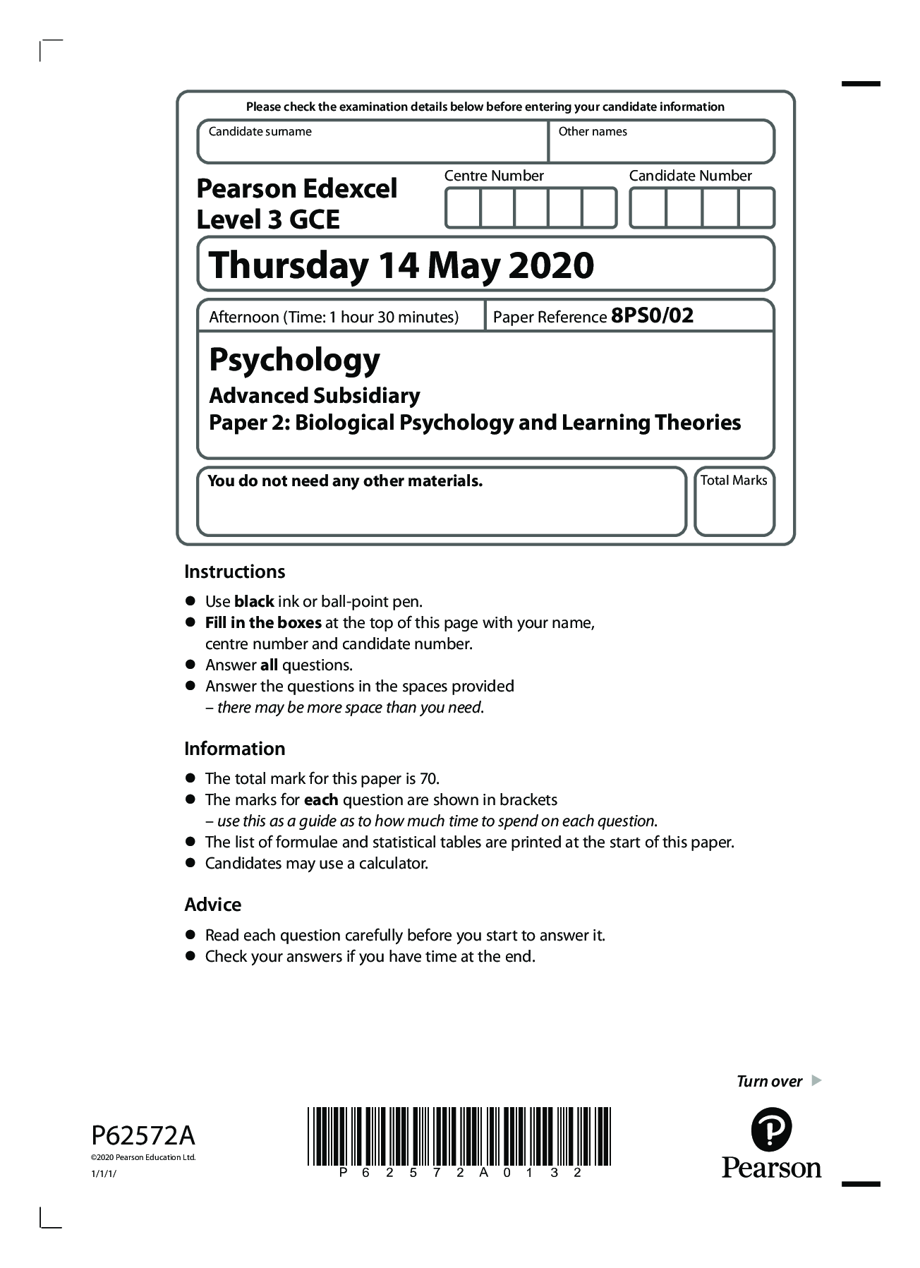 Pearson Edexcel_Psychology_8PS0/02 Question Paper 2020 | Paper 2: Biological Psychology and Learning Theories Pearson Edexcel_Psychology_8PS0/02 Mark Scheme_2020 | Paper 2: Biological Psychology and...