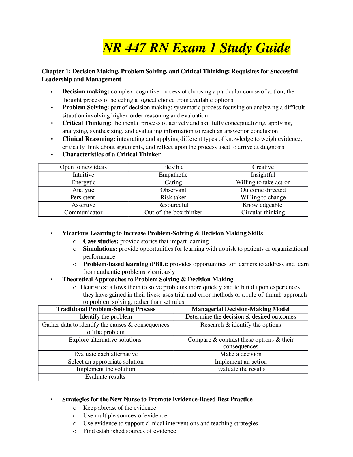 Chamberlain College of Nursing - NR 447 RN Exam 1, 2 & 3 Study Guides, 2021