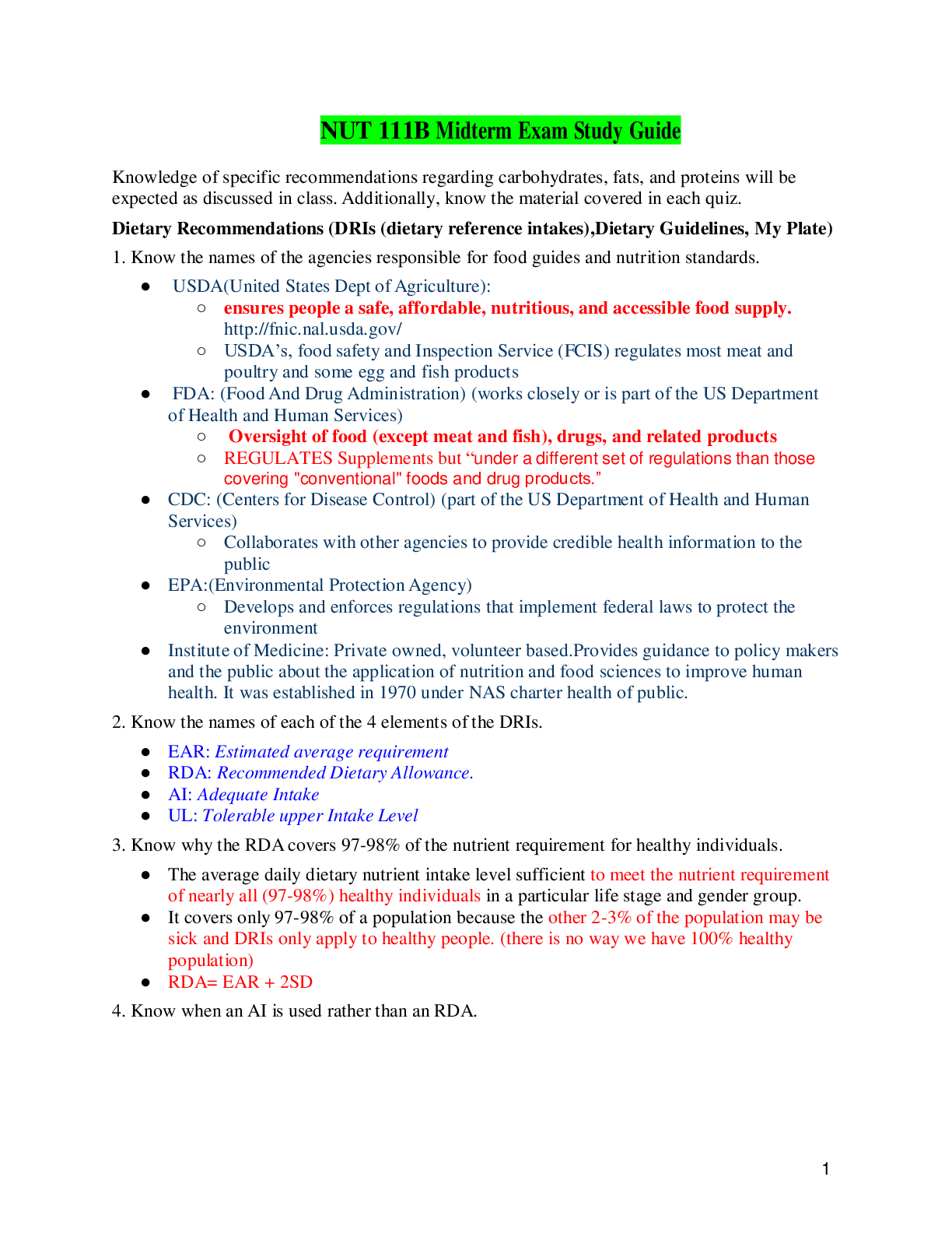 NUT 111B - Midterm &Final Exams Study Guides|NUT 111B - Midterm &Final Exams Study Guides