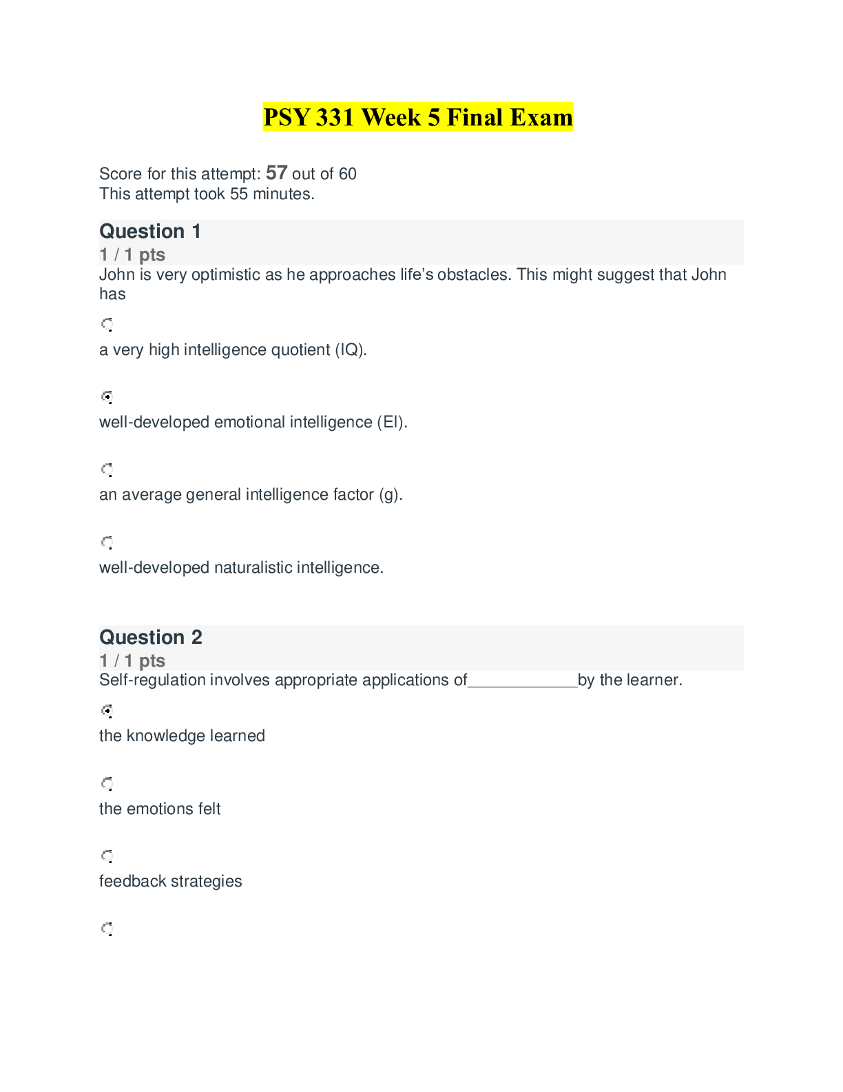 PSY 331 Week 5 Final Exam (Two Versions) - Ashford University|PSY 331 Week 5 Final Exam (Two Versions) - Ashford University