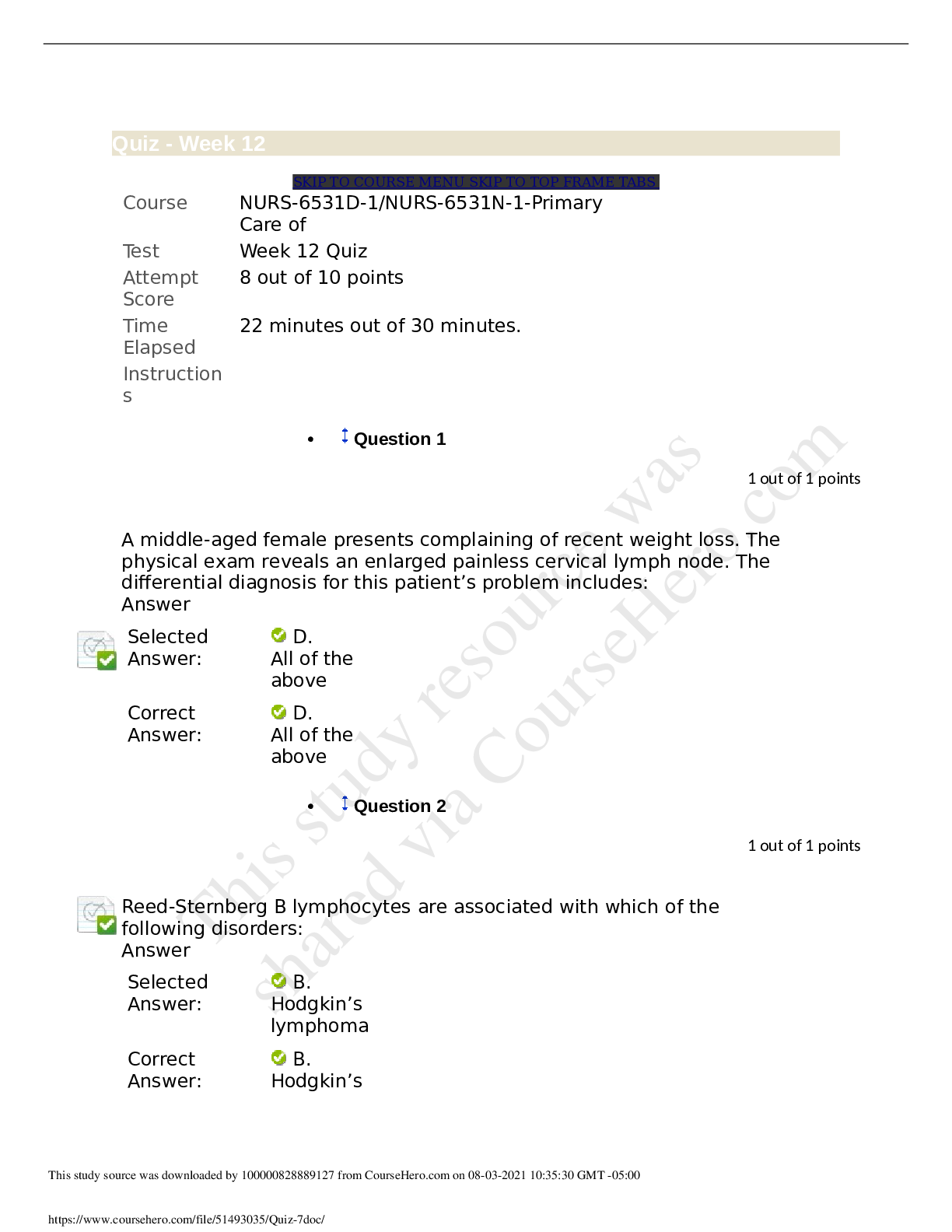 The Week 7 quiz has 2 questions and you will have one attempt to answers. For your better preparation use the questions below which appeared in recent test: NR 509 Week 7 Midweek Comprehension (Jun...