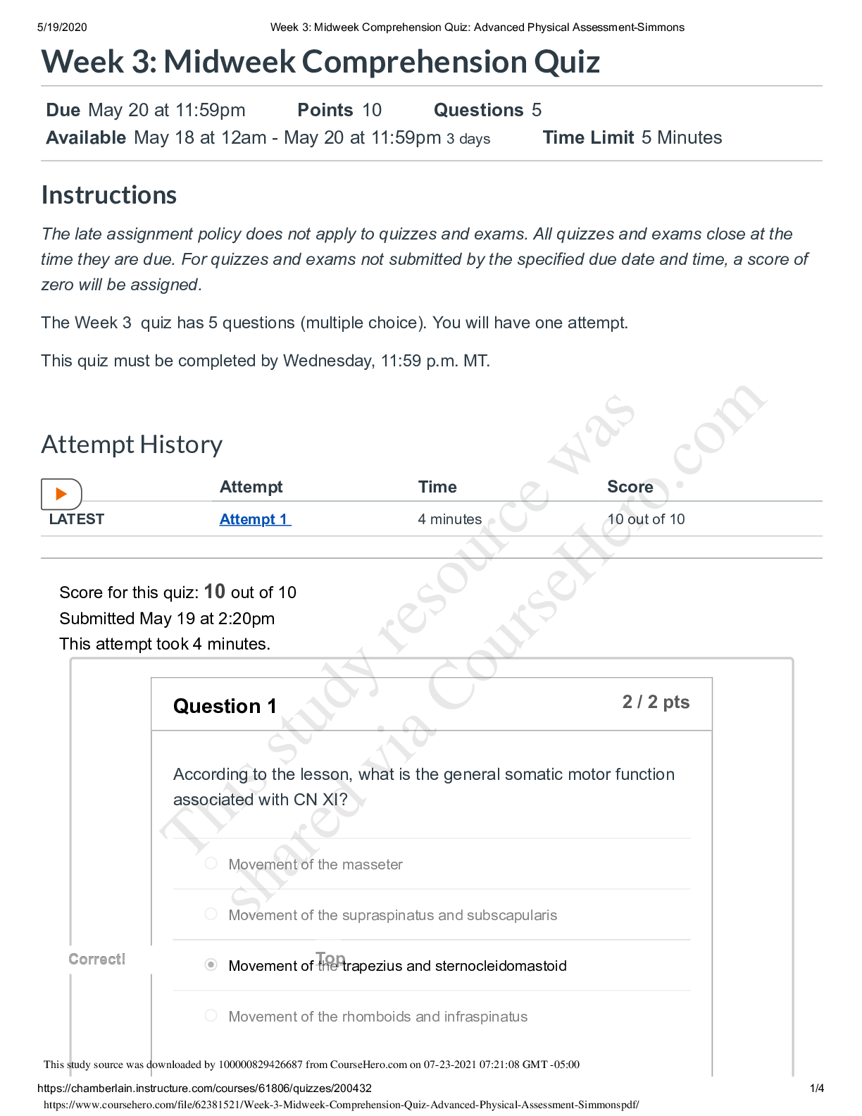 NR 509 Week 3 Midweek Comprehension Quiz (July 2020) Question : According to the lesson, movement of the scalp, forehead, and nose is the function of which branch of CN V? Question: According to the...
