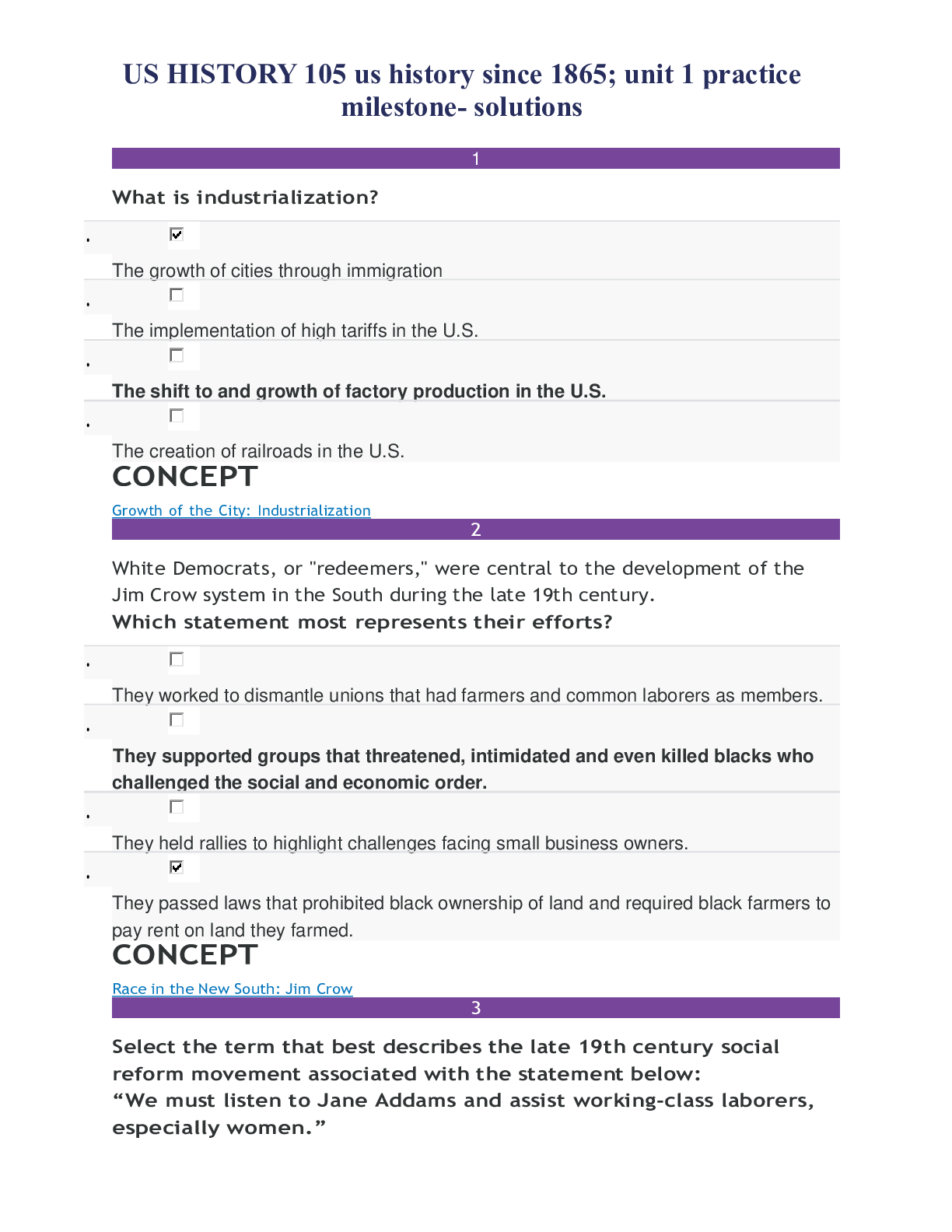 US HISTORY 105 us history since 1865; unit 1 practice milestone- solutions US HISTORY 105 us history since 1865 Unit 1 milestone quiz (answered) latest 2021 (100% correct) US HISTORY 105 us history si...