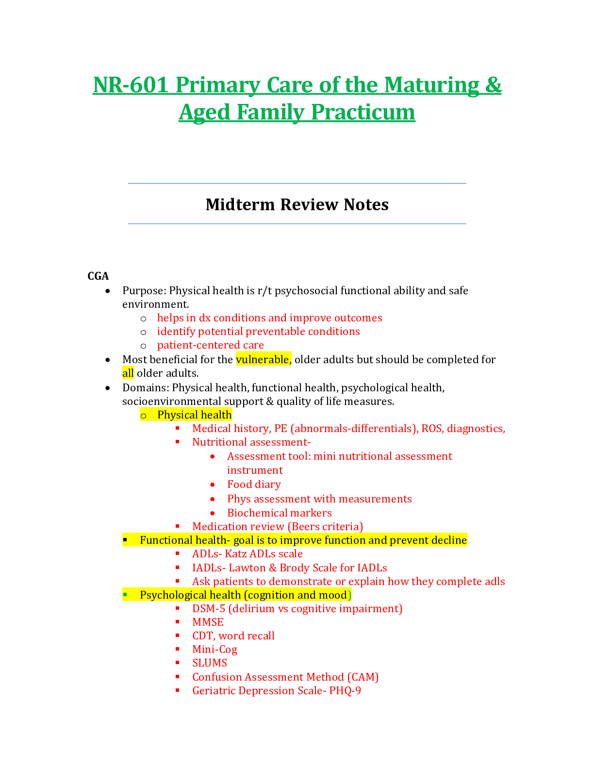 This BUNDLE set consists of 2 different versions of NR601 / NR-601 Primary Care of the Maturing & Aged Family Practicum Midterm Review Weeks 1 – 4 Notes.