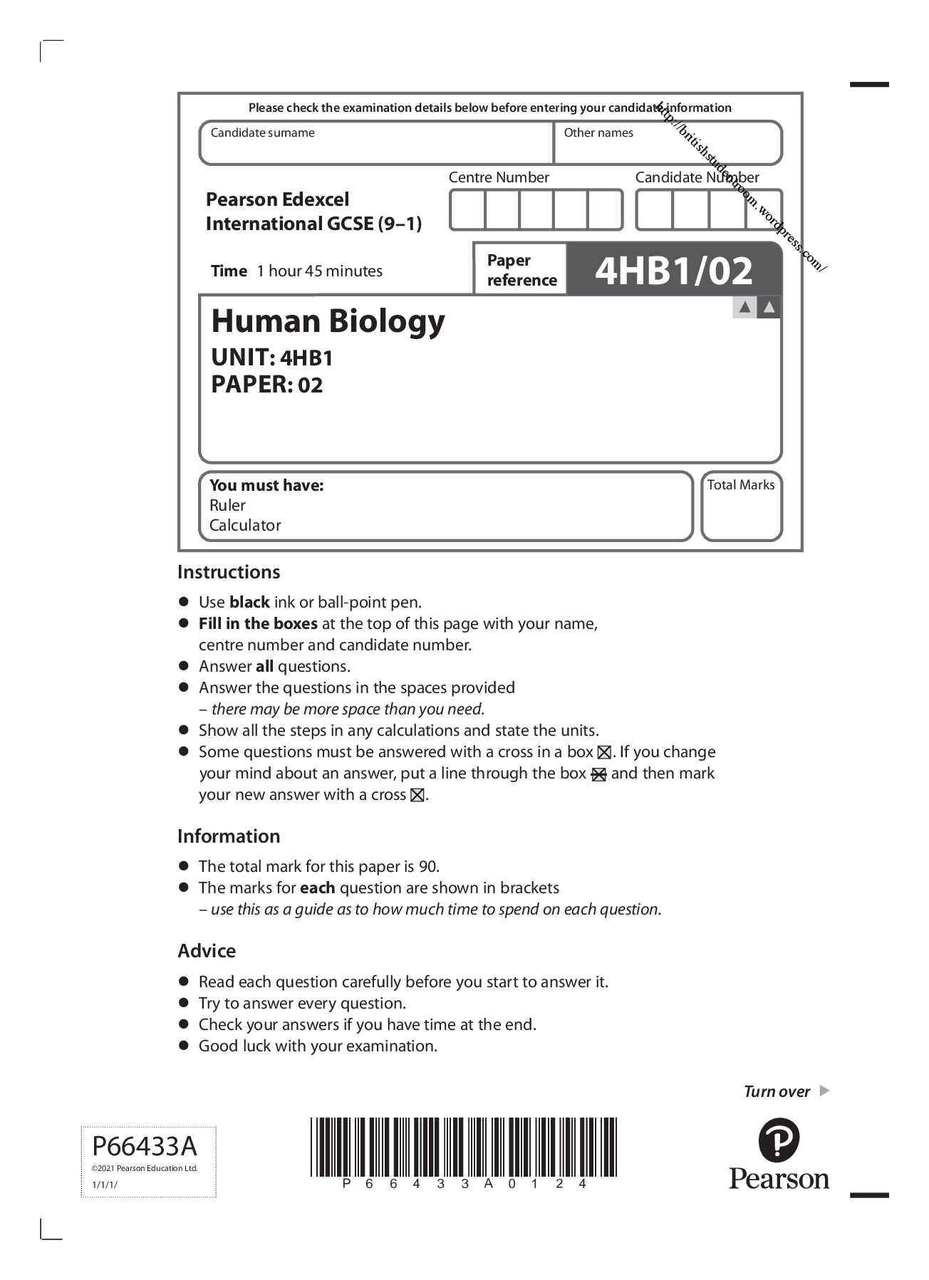 Pearson Edexcel International GCSE (9–1)_Human Biology_4HB1/02 Question Paper June 2021 | Paper 2 Pearson Edexcel International GCSE_Human Biology_4HB1/02 Mark Scheme June 2021 | Paper 2