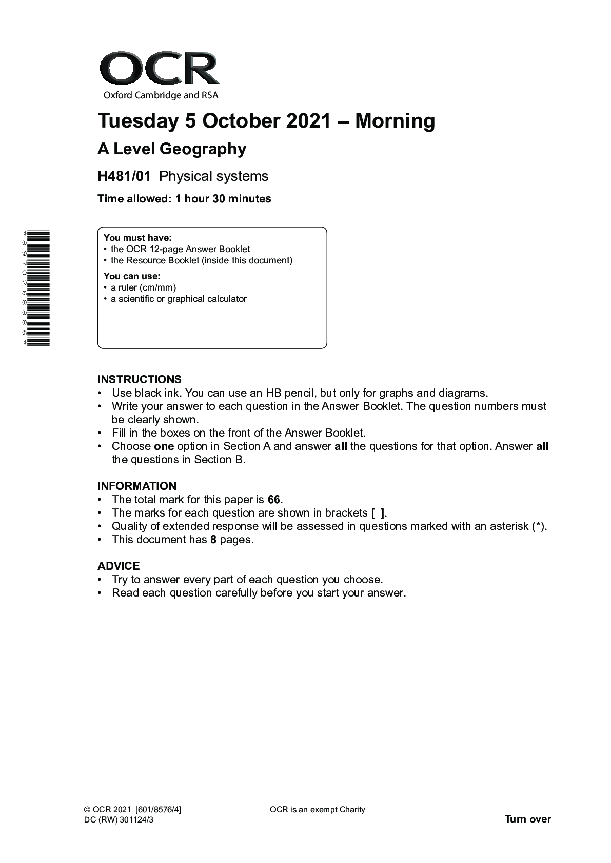 OCR_A Level Geography_H481/01 Question Paper Oct 2021 | Physical systems OCR_A Level Geography_H481/01 Mark Scheme Oct 2021 | Physical Systems