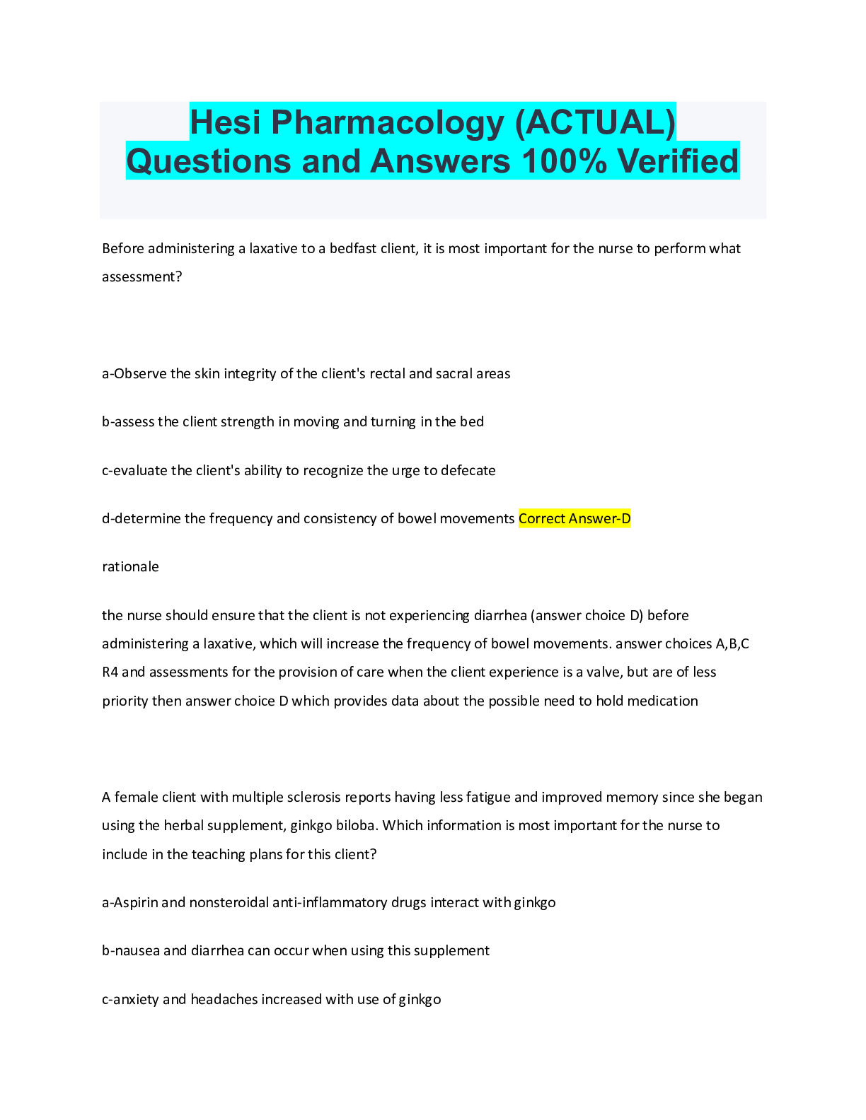 HESI PN Gerontology Practice Exam Latest Updated 2022 Already Passed Hesi Pharmacology (ACTUAL) Questions and Answers 100% Verified HESI Pharmacology Practice Test Latest Updated 2022 Rated A...