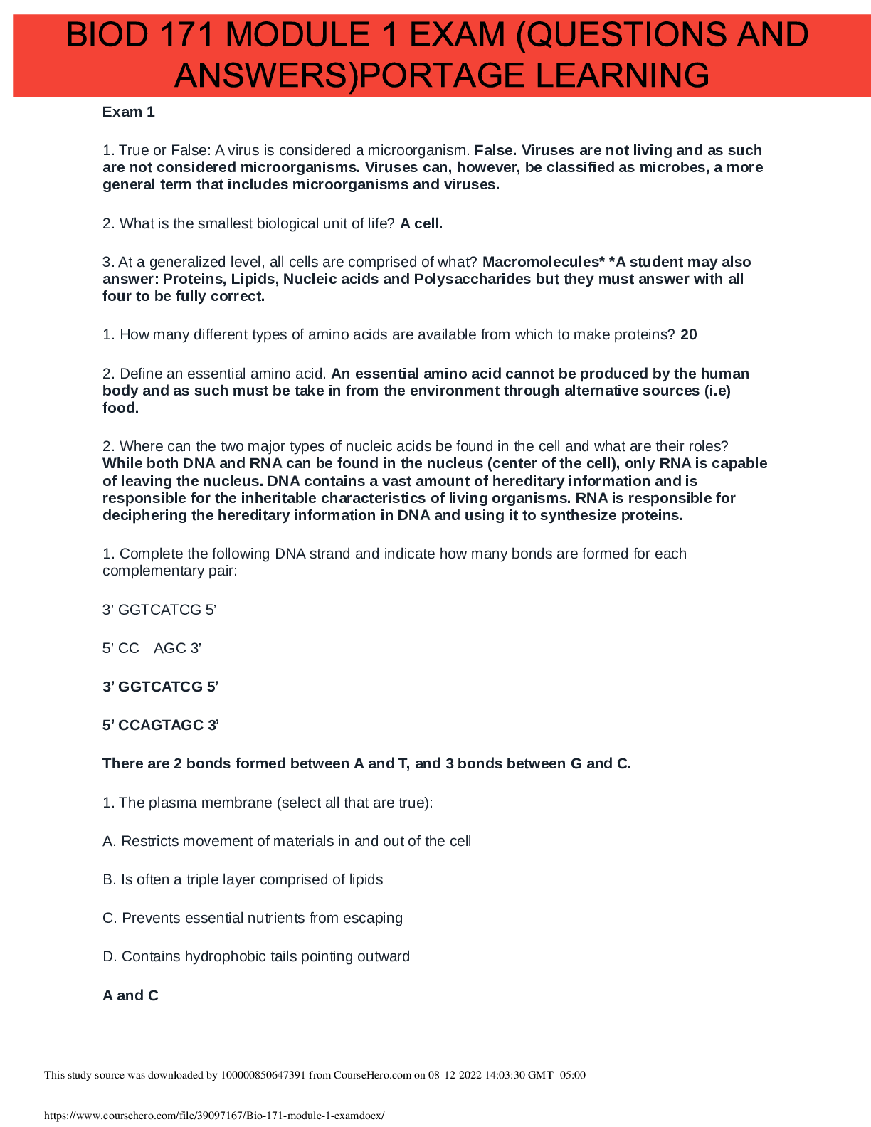 BIO 171 Module Exams 1-6 PORTAGE LEARNING/BIO 171 Module Exams 1-6 PORTAGE LEARNING/BIO 171 Module Exams 1-6 PORTAGE LEARNING.