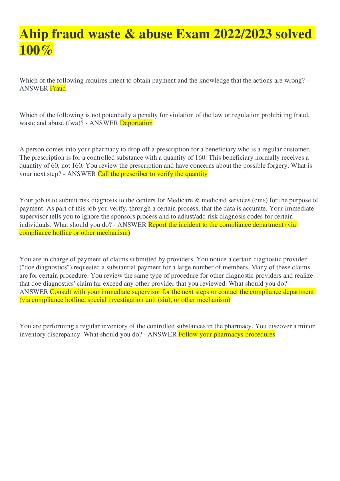 Ahip fraud waste & abuse Exam 2022/2023 solved 100% And AHIP TRAINING Medicare Fraud, Waste, and Abuse Training 2022/2023 100% Answered