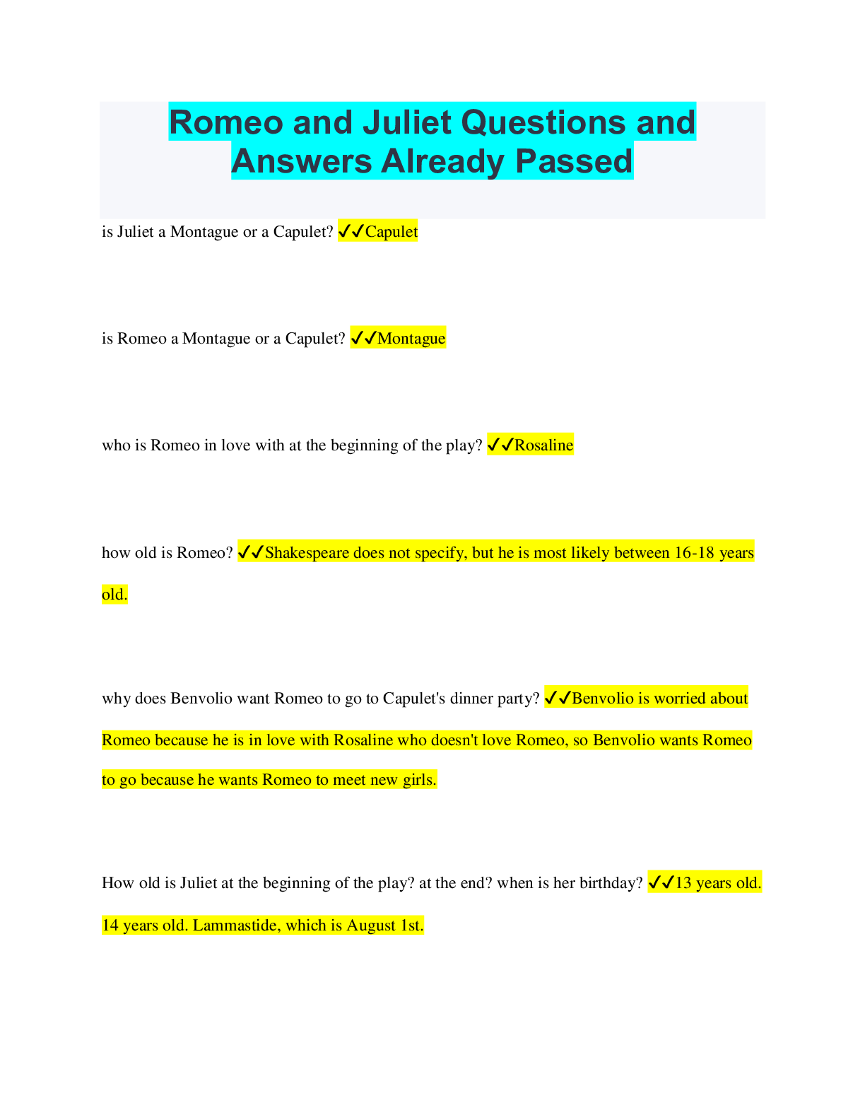 Romeo and Juliet Bundled Exams Questions and Answers Already Passed