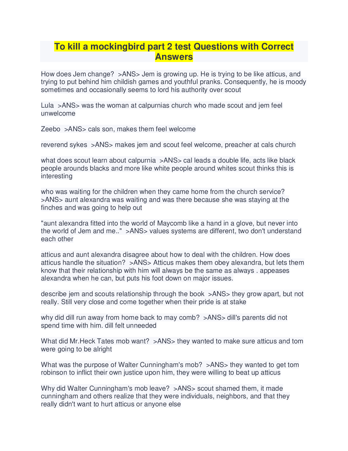 To kill a mockingbird part 2 test Questions with Correct Answers To Kill a Mockingbird (Part 2) Questions with Answers To Kill a Mockingbird Test (Part 2) Questions with Correct Answers To Ki...