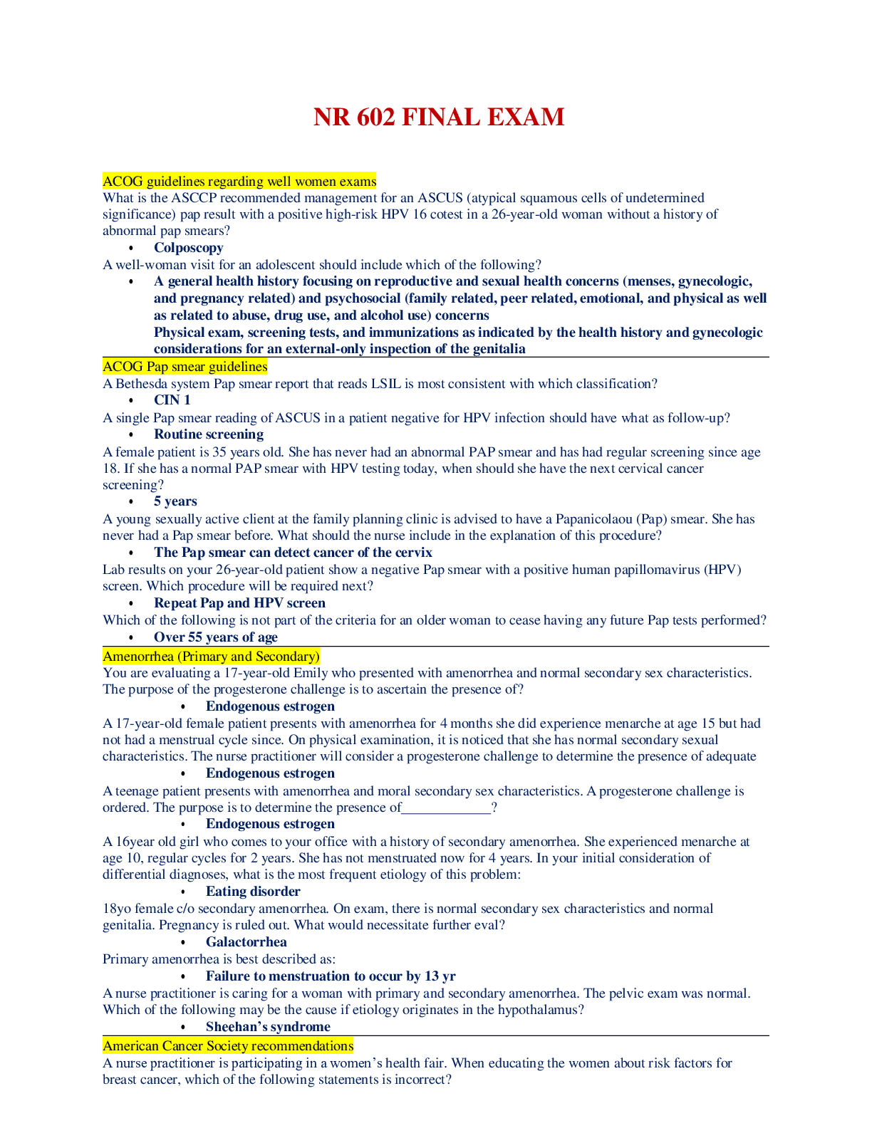 This BUNDLE set consists of 3 different versions of NR601 / NR-601 Primary Care of the Maturing & Aged Family Practicum Final Exam Study Guide.