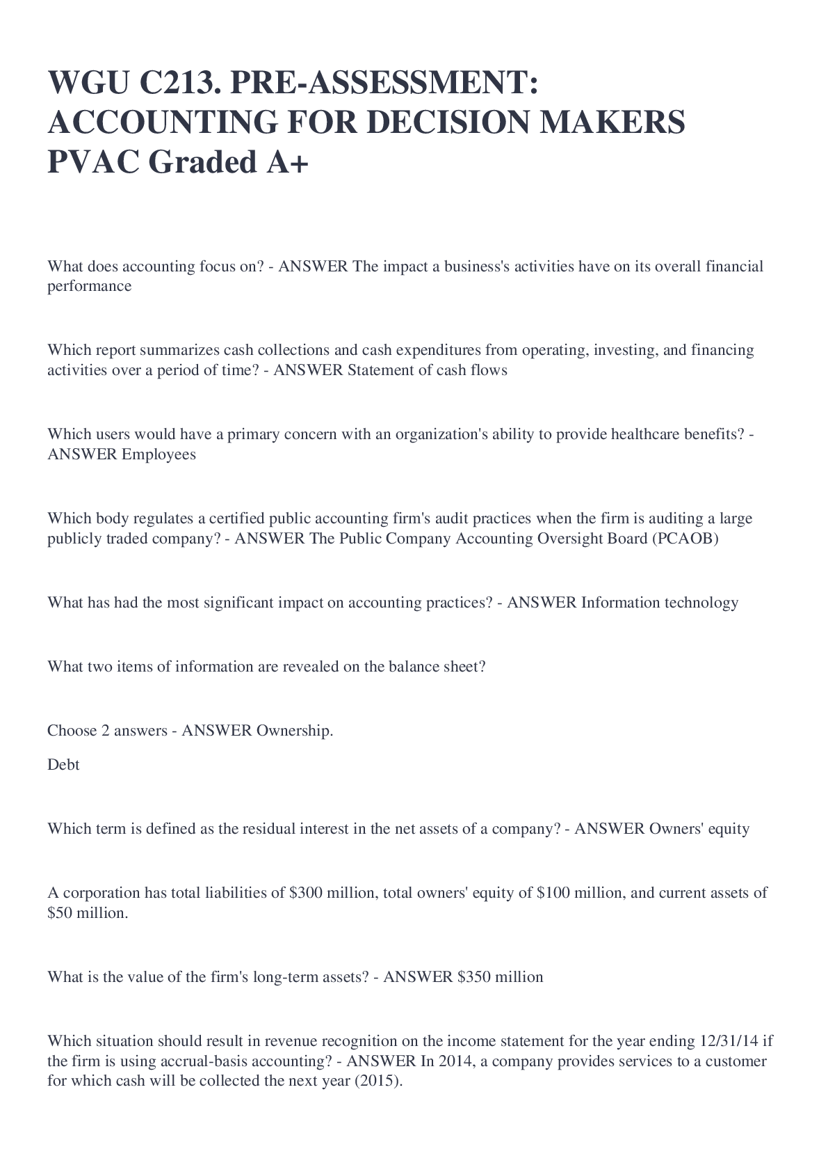 WGU C213. PRE-ASSESSMENT: ACCOUNTING FOR DECISION MAKERS PVAC Graded A+ WGU C213 Pre-Assessment 2022/2023 with Complete Solutions WGU C213 PRE-ASSESSMENT (Only Calc question) Latest Updated with Com...
