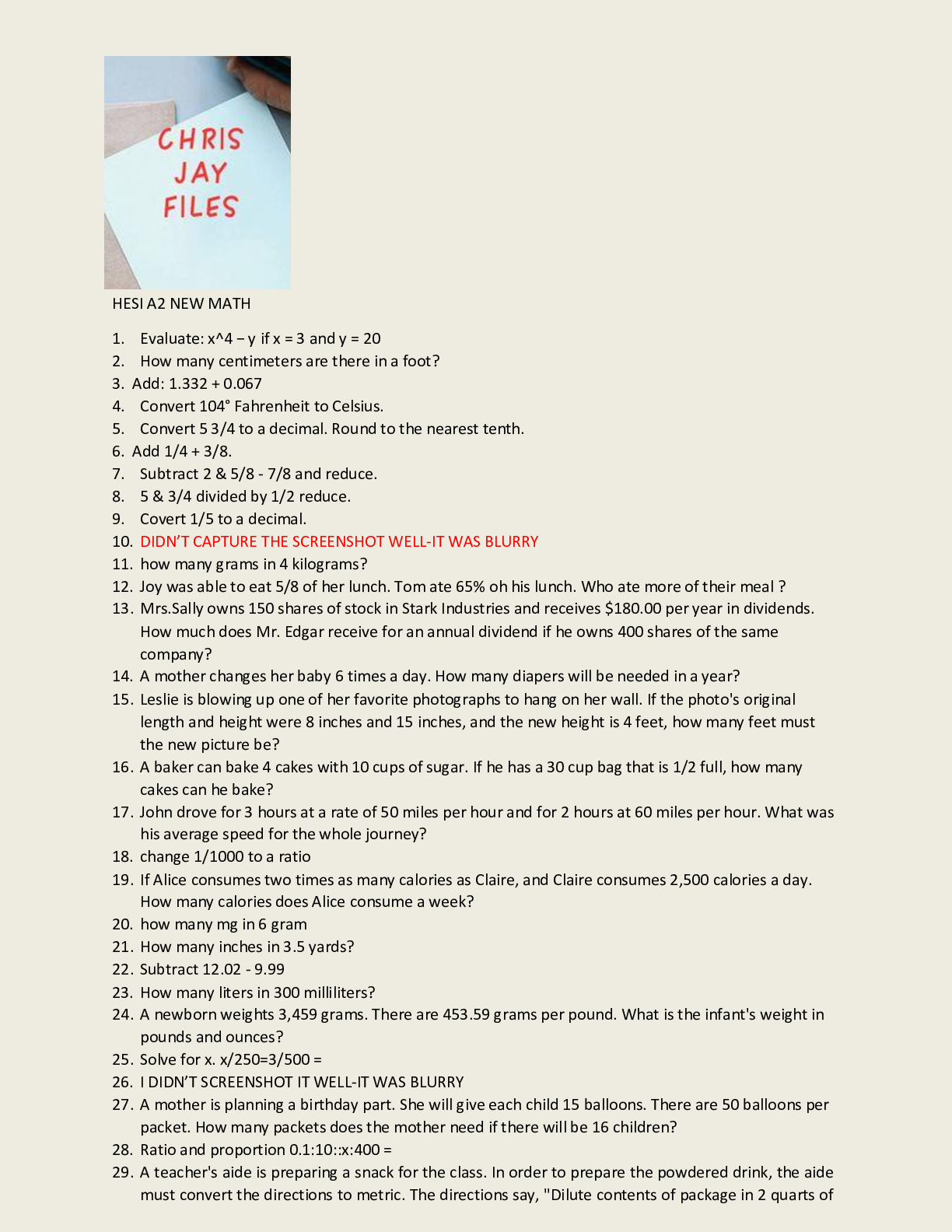 HESI A2 NEW MATH 1. Evaluate: x^4 − y if x = 3 and y = 20 2. How many centimeters are there in a foot? 3. Add: 1.332 + 0.067 4. Convert 104° Fahrenheit to Celsius. 5. Convert 5 3/4 to a decimal. R...