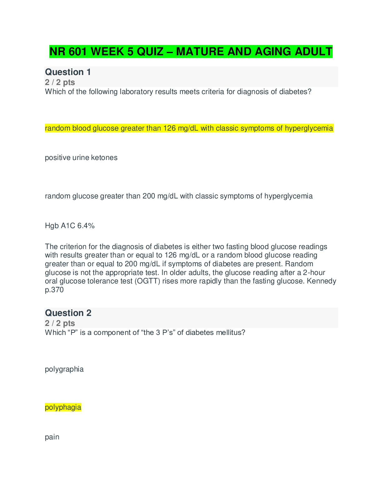 NR 601 WEEK 5 QUIZ – MATURE AND AGING ADULT Question 1 2 / 2 pts Which of the following laboratory results meets criteria for diagnosis of diabetes? Question 2 2 / 2 pts Which “P” is a com...