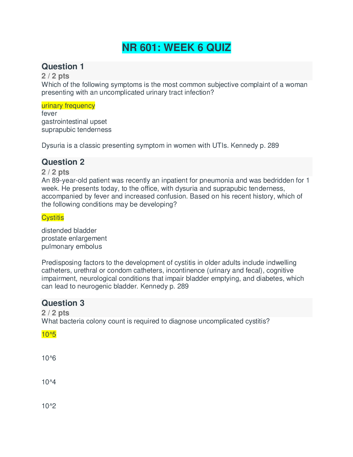 NR 601: WEEK 6 QUIZ Question 1 2 / 2 pts Which of the following symptoms is the most common subjective complaint of a woman presenting with an uncomplicated urinary tract infection? Question...