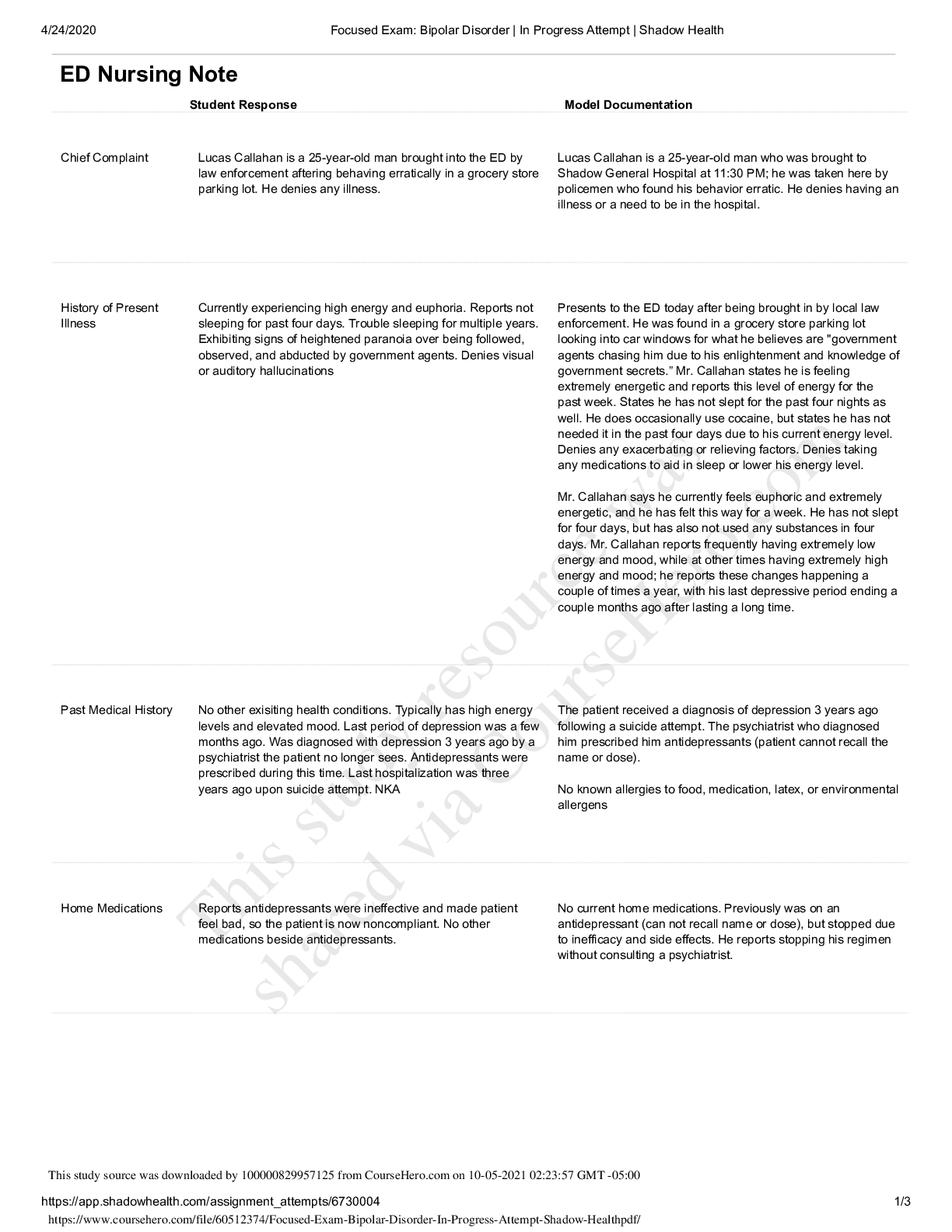 *NURSING> SHADOW HEALTH > Focused Exam:Bipolar Disorder _ In Progress Attempt _ED Nursing Note (All)
