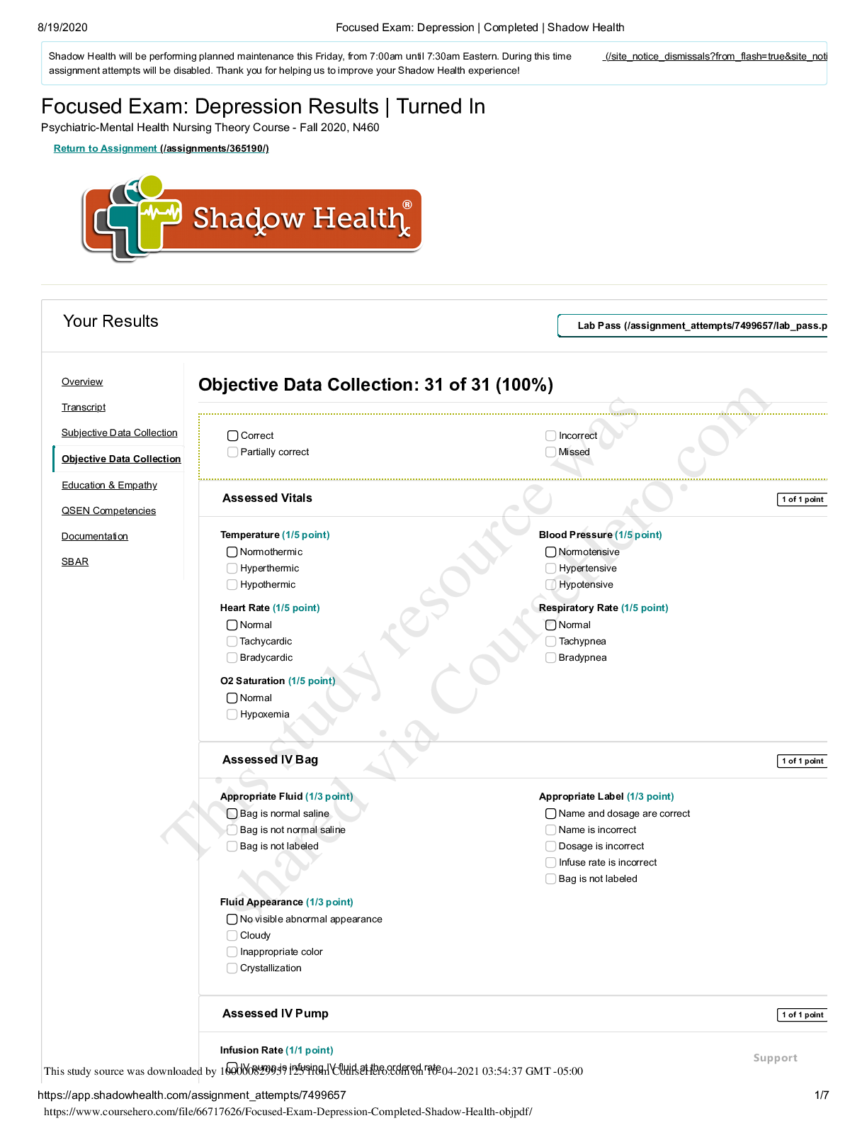 Focused Exam_ Depression _ Completed _ Shadow Health obj. Results Turned In. (Thought, Intravenous therapy, Mental status examination)