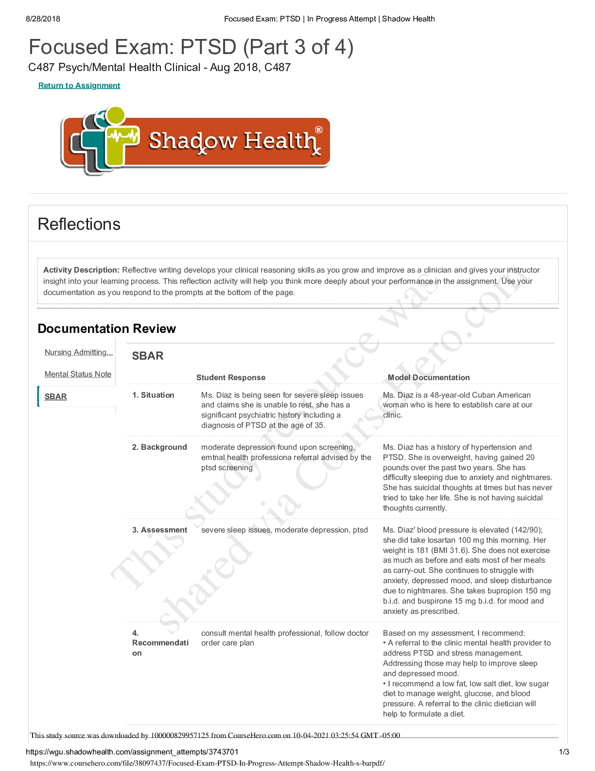 *NURSING> SHADOW HEALTH > Focused Exam:PTSD (SBAR). GRADED. (All)