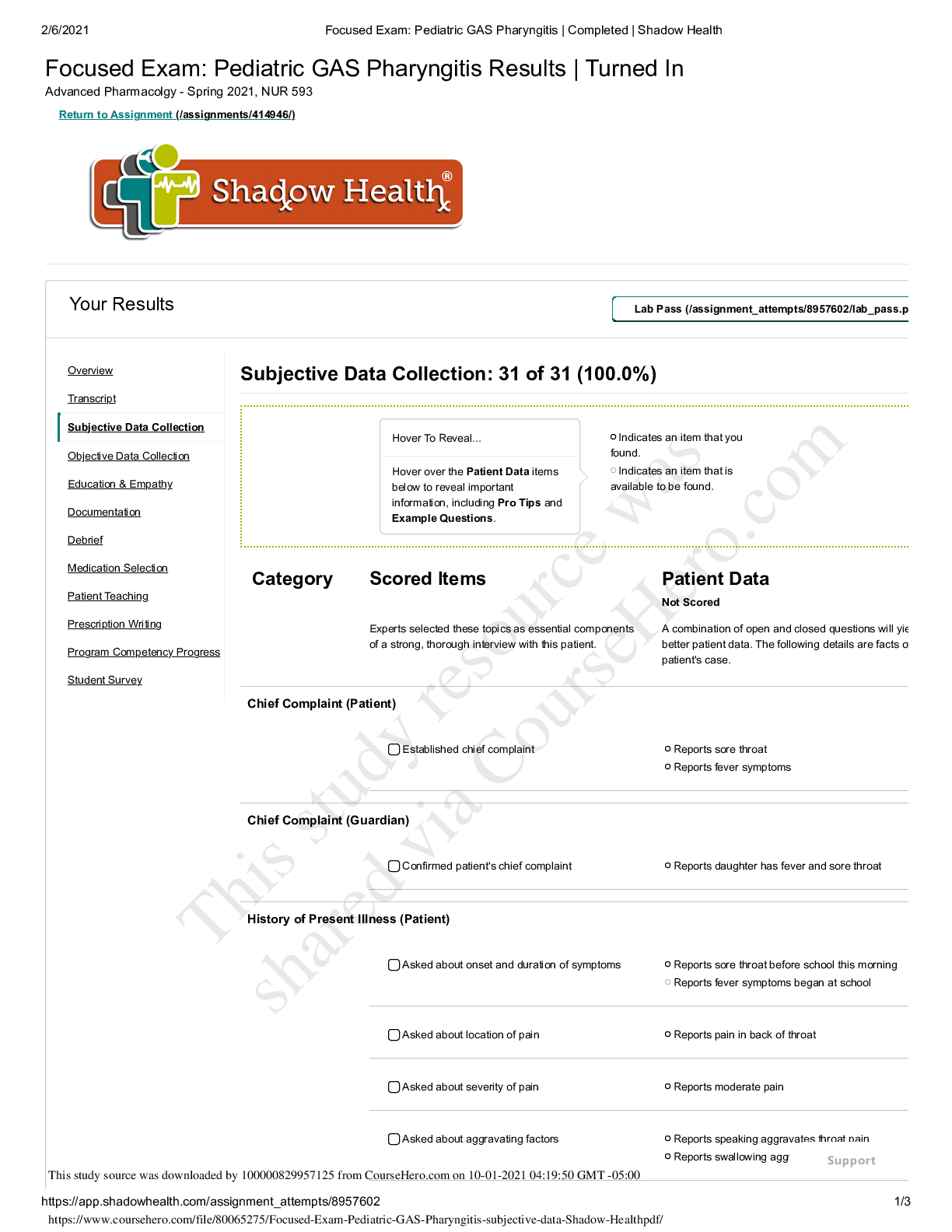 *NURSING> SHADOW HEALTH > Focused Exam_ Pediatric GAS Pharyngitis _ subjective data_ Shadow Health. (All)