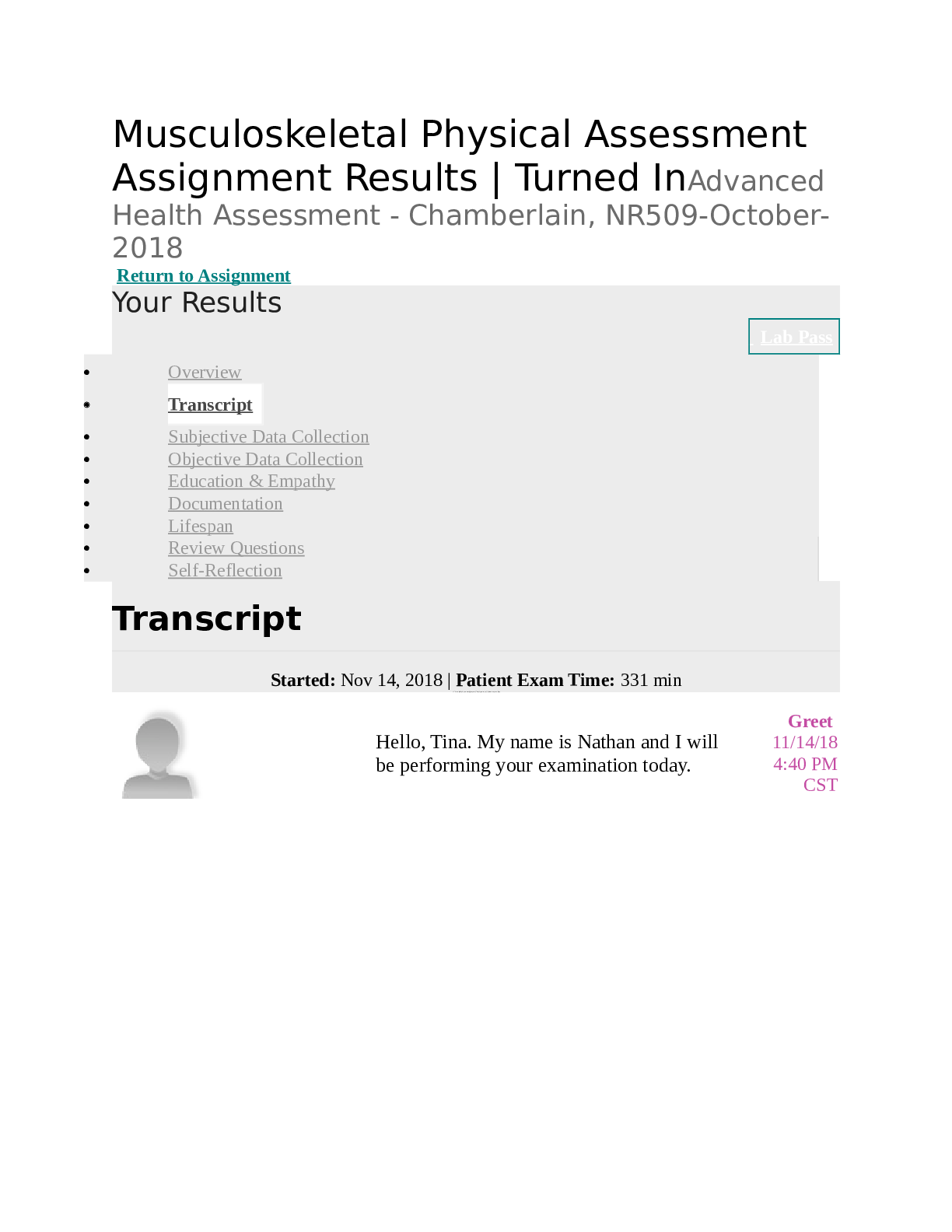 NR 509 Shadow Health - Musculoskeletal Physical Assessment Assignment - Transcript.