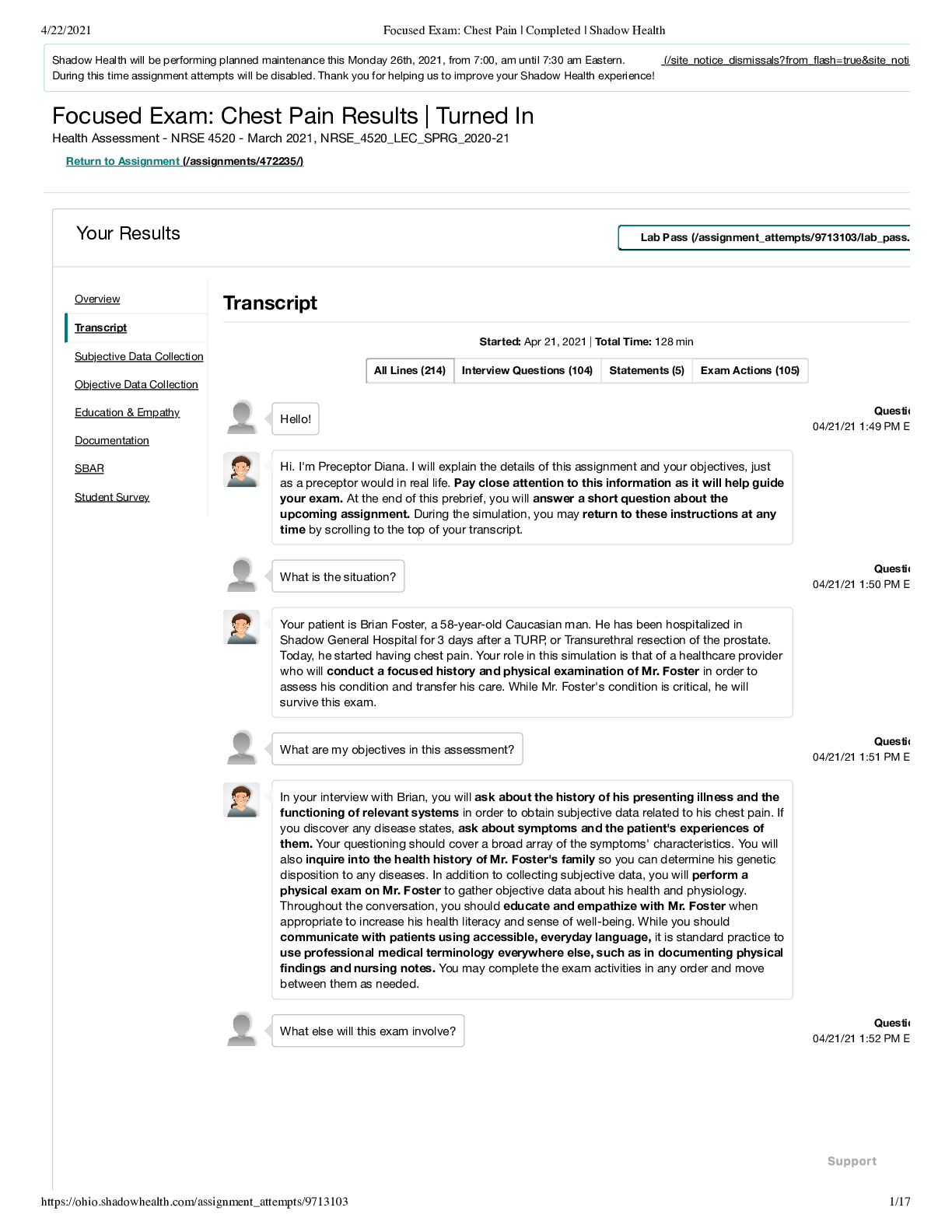 *NURSING> SHADOW HEALTH > Focused Exam Brian Foster Chest Pain Education and Empathy (All)