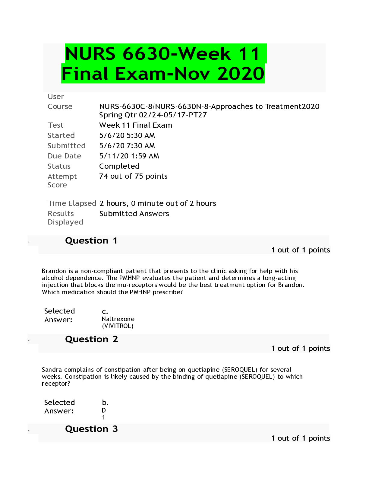 NURS6630-Week 11 Final Exam-2020 Course NURS-6630N-,Approaches to Treatment.2020 Spring Qtr 02/24-05/17- Test Week 11 Final Exam Due Date 5/11/20 1:59 AM Status Completed Attempt Score 72 out...