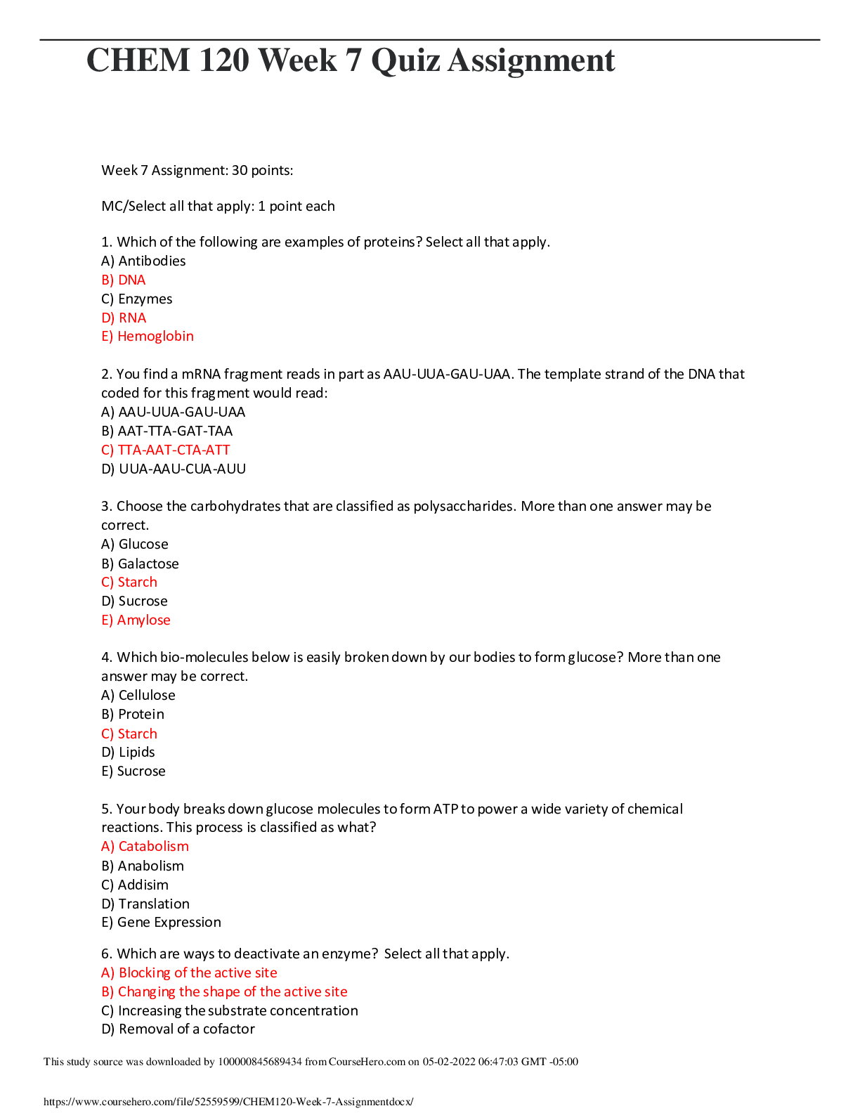 CHEM 120 Week 7 Quiz Assignment Week 7 Assignment: 30 points: MC/Select all that apply: 1 point each 1. Which of the following are examples of proteins? Select all that apply. A) Antibod...