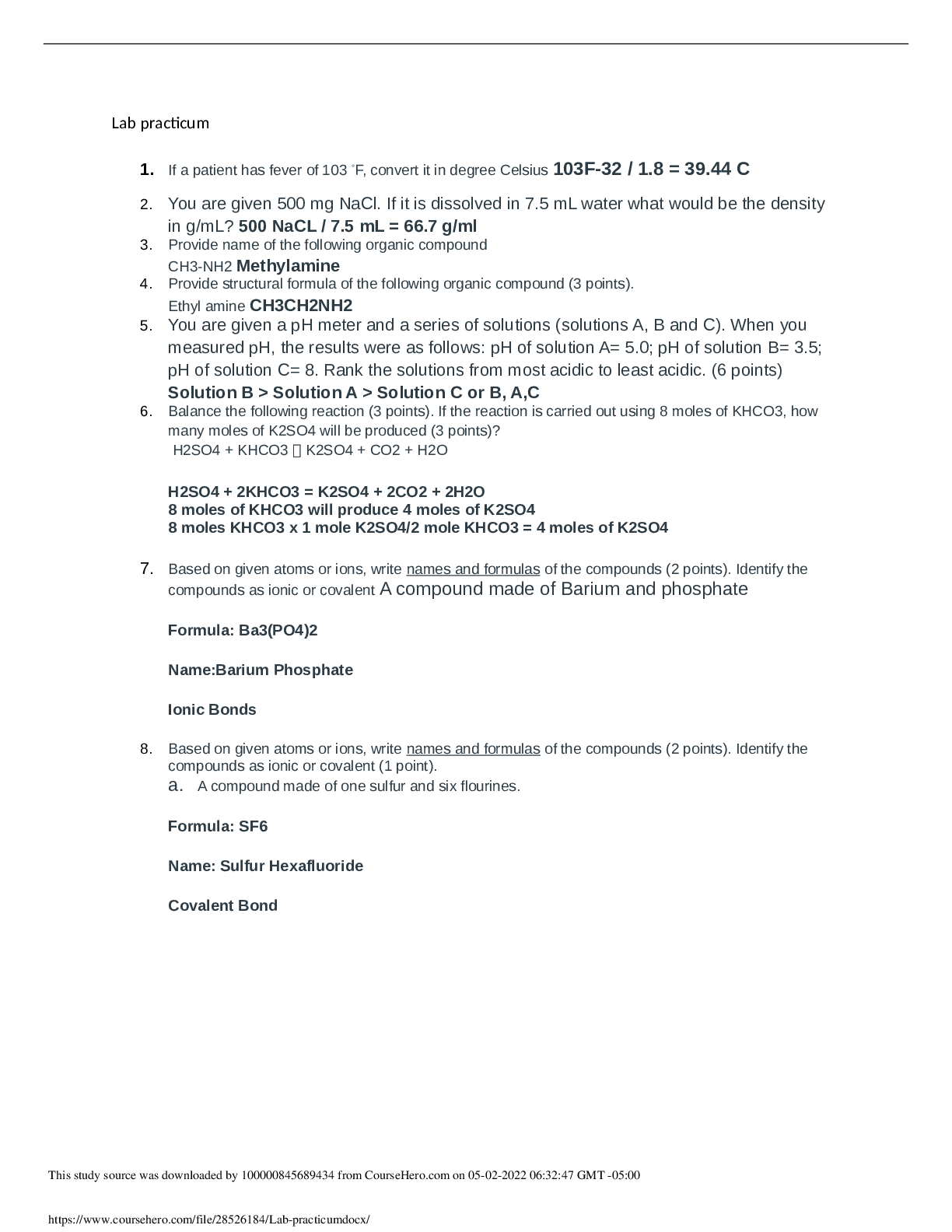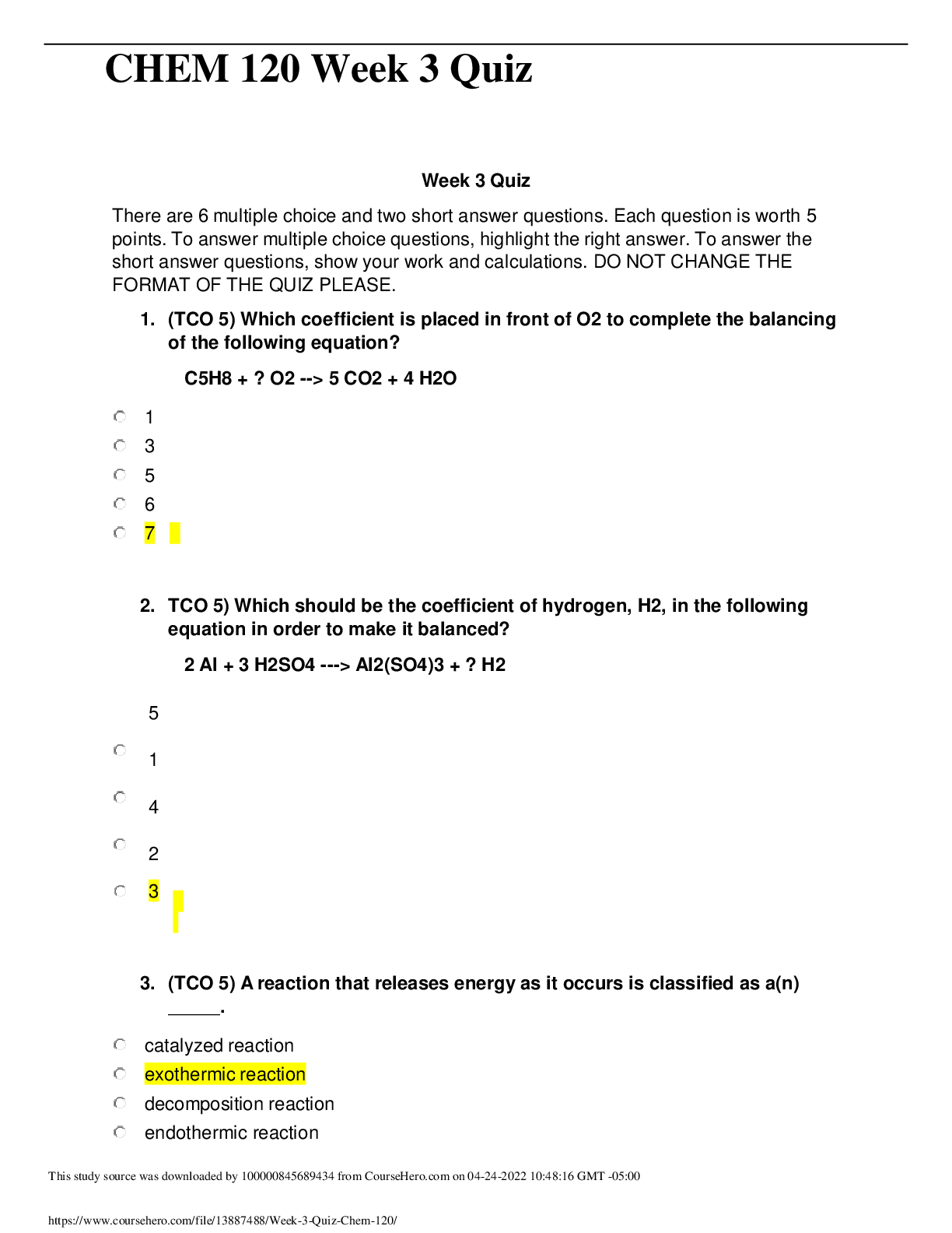 CHEM 120 Week 3 Quiz Week 3 Quiz There are 6 multiple choice and two short answer questions. Each question is worth 5 points. To answer multiple choice questions, highlight the right answer. To...