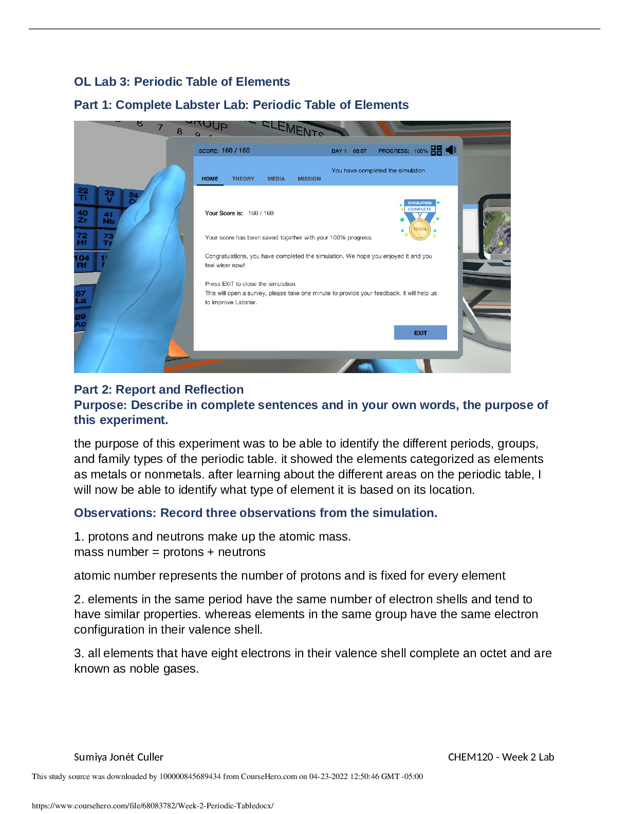 CHEM 120 Unit 2 Lab: OL Lab 3: Periodic Table of Elements