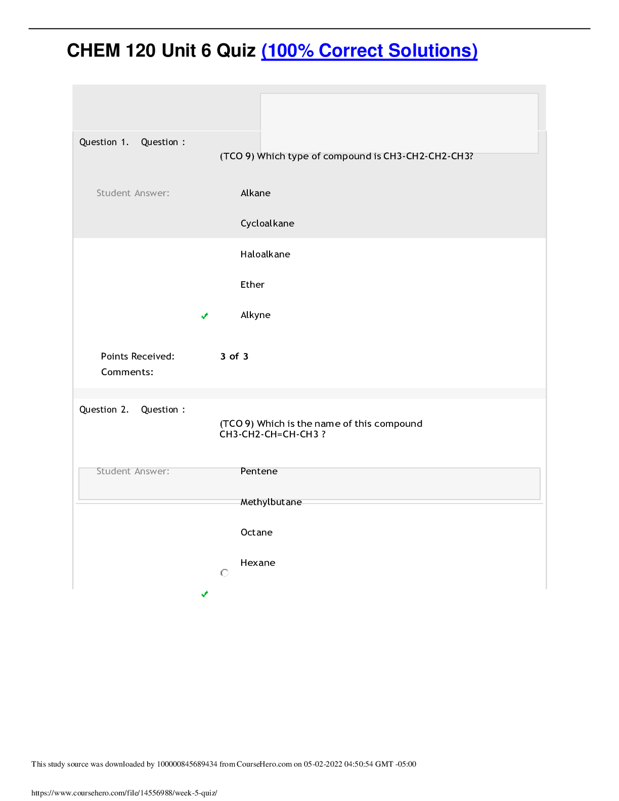 CHEM 120 Unit 6 Quiz (100% Correct Solutions) Question 1. Question : (TCO 9) Which type of compound is CH3-CH2-CH2-CH3? Student Answer: Alkane Cycloalkane Haloalkane Ether Alkyne...
