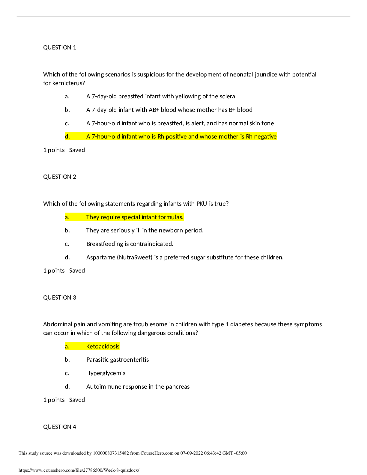 NURS 6541 Week 8 Quiz – Question and Answers Which of the following scenarios is suspicious for the development of neonatal jaundice with potential for kernicterus? Which of the following statemen...