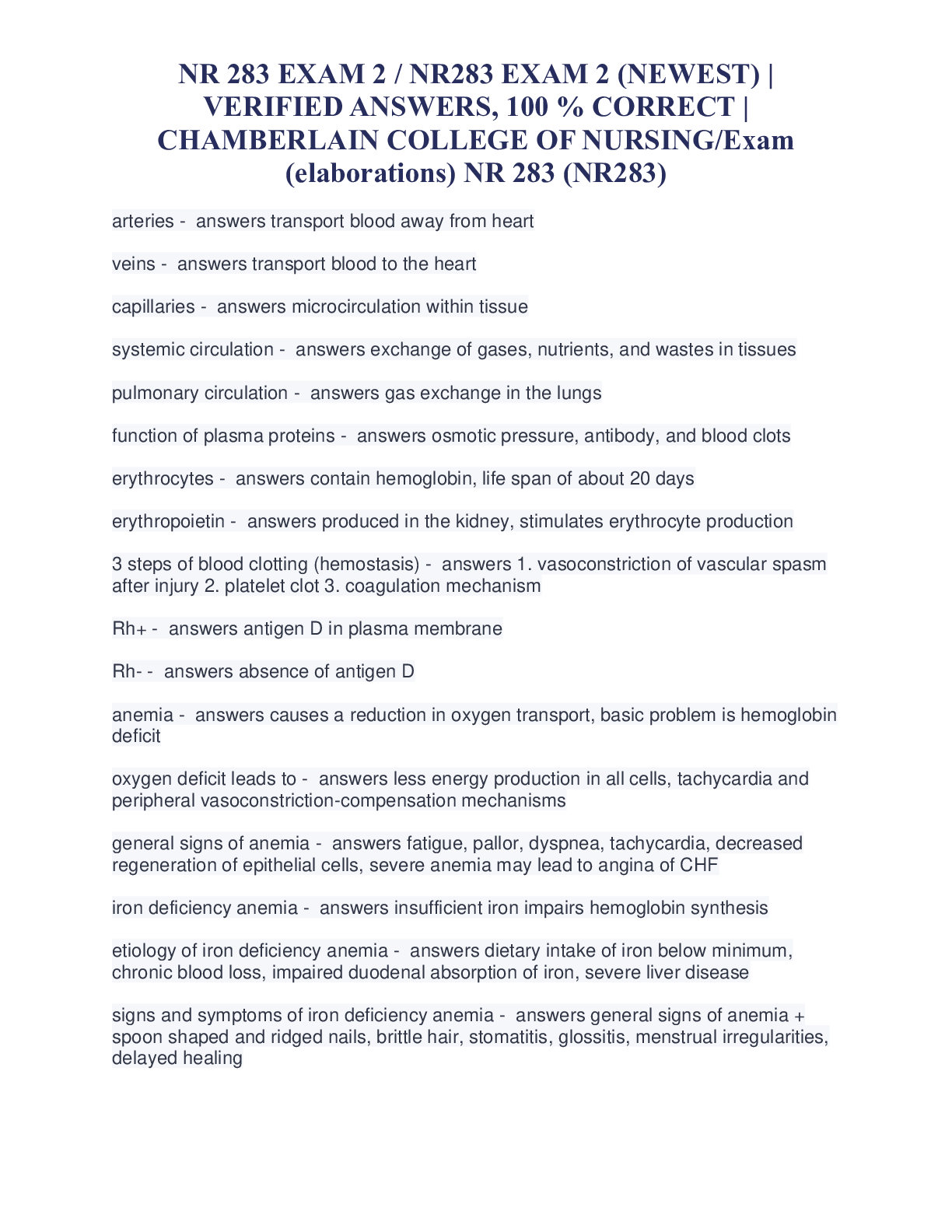 NR 283 EXAM 2 / NR283 EXAM 2 (NEWEST) | VERIFIED ANSWERS, 100 % CORRECT | CHAMBERLAIN COLLEGE OF NURSING/Exam (elaborations) NR 283 (NR283)