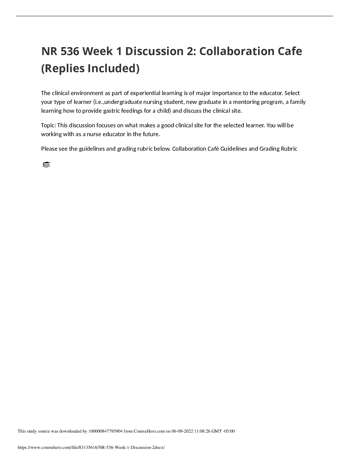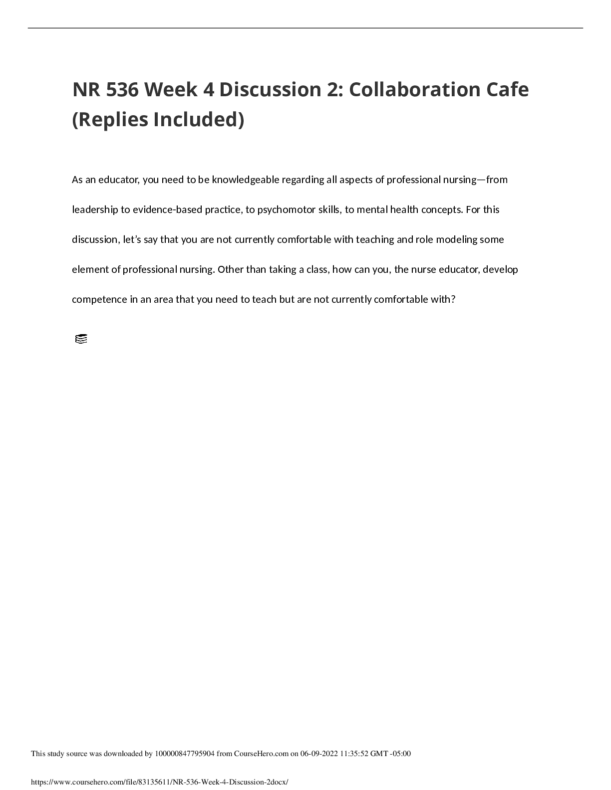 NR 536 Week 1 Discussion 1: Education Theory and Learners (Replies Included) NR-536 Week 1 Discussion 2: Collaboration Café (Replies Included) NR 536 Week 2 Discussion 1: Skills to Help Learners ... Develop (Replies Included) NR-536 Week 2 Discussion 2: Collaboration Café (Replies Included) NR 536 Week 3 Assignment: Developing Critical Thinking Questions NR-536 Week 3 Discussion 1: Experimental Learning Environments (Replies Included) NR 536 Week 3 Discussion 2: Collaboration Café (Replies Included) NR 536 Week 4 Discussion 1: Teaching Methods (Replies Included) NR-536 Week 4 Discussion 2: Collaboration Café (Replies Included) NR 536 Week 5 Assignment: Develop an Evolving Case Study (2 Versions) NR-536 Week 5 Discussion: Collaboration Café (Replies Included) NR 536 Week 6 Discussion 1: Learning Activities in the Skills Laboratory (Replies Included) NR-536 Week 6 Discussion 2: Collaboration Café (Replies Included) NR 536 Week 7 Assignment: Designing an Experiential Learning Activity NR-536 Week 7 Discussion Question: Collaboration Café NR 536 Week 8 Discussion Question NR-536 Week 8 Discussion Question: Collaboration Café [Show More]