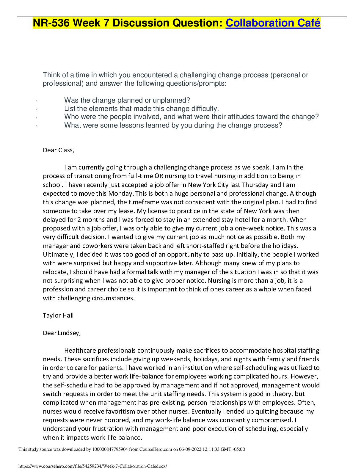 NR-536 Week 7 Discussion Question: Collaboration Café Think of a time in which you encountered a challenging change process (personal or professional) and answer the following questions/promp...