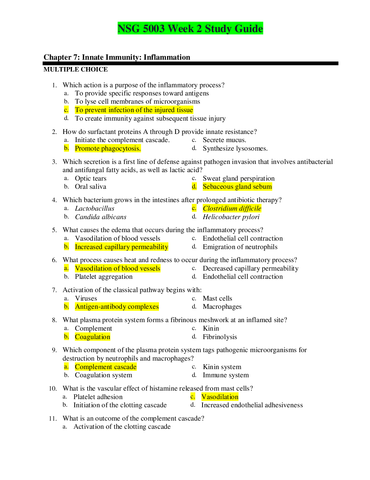 NSG 5003 Week 2 Study Guide Chapter 7: Innate Immunity: Inflammation MULTIPLE CHOICE 1. Which action is a purpose of the inflammatory process? 2. How do surfactant proteins A through D...