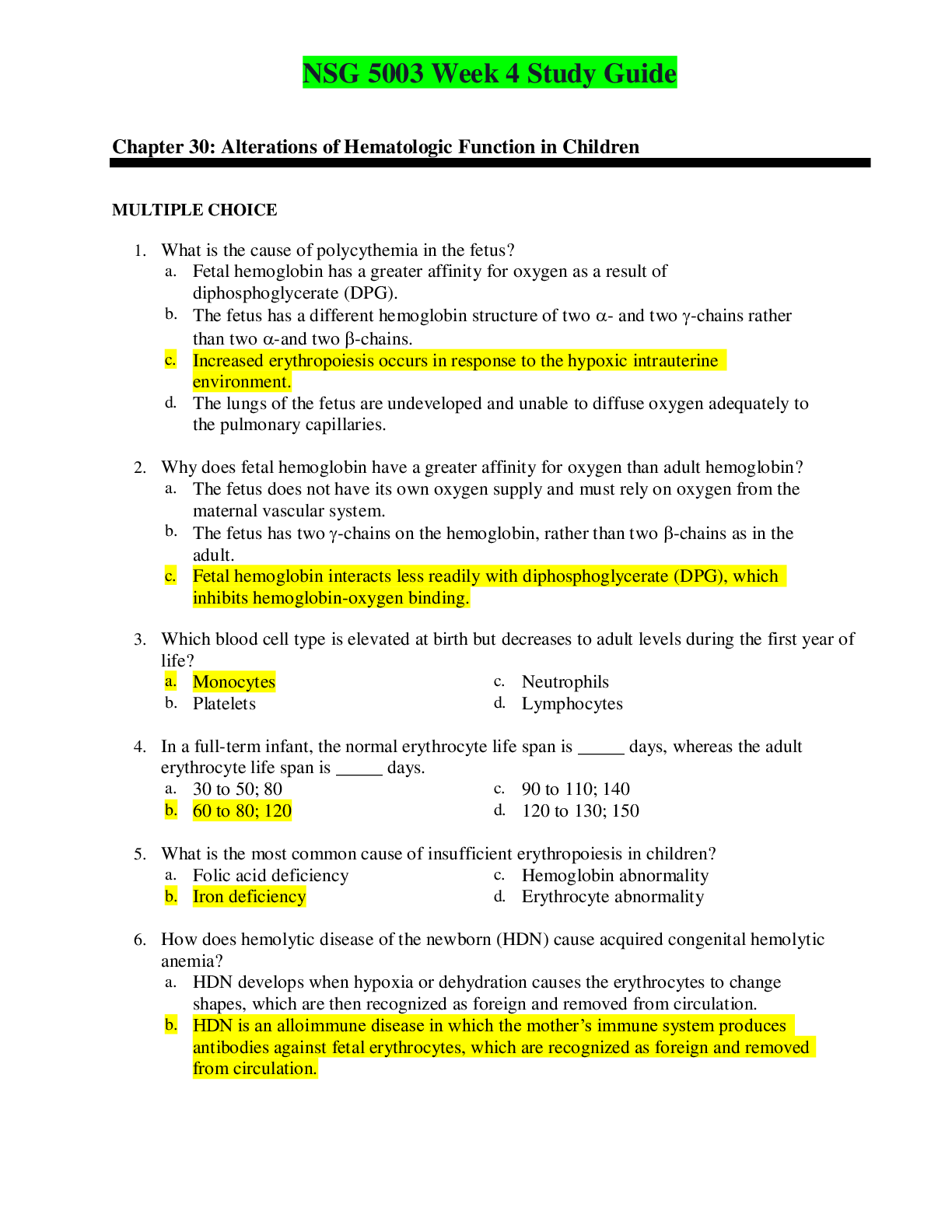 NSG 5003 Week 4 Study Guide Chapter 30: Alterations of Hematologic Function in Children MULTIPLE CHOICE 1. What is the cause of polycythemia in the fetus? 2. Why does fetal hemoglobi...