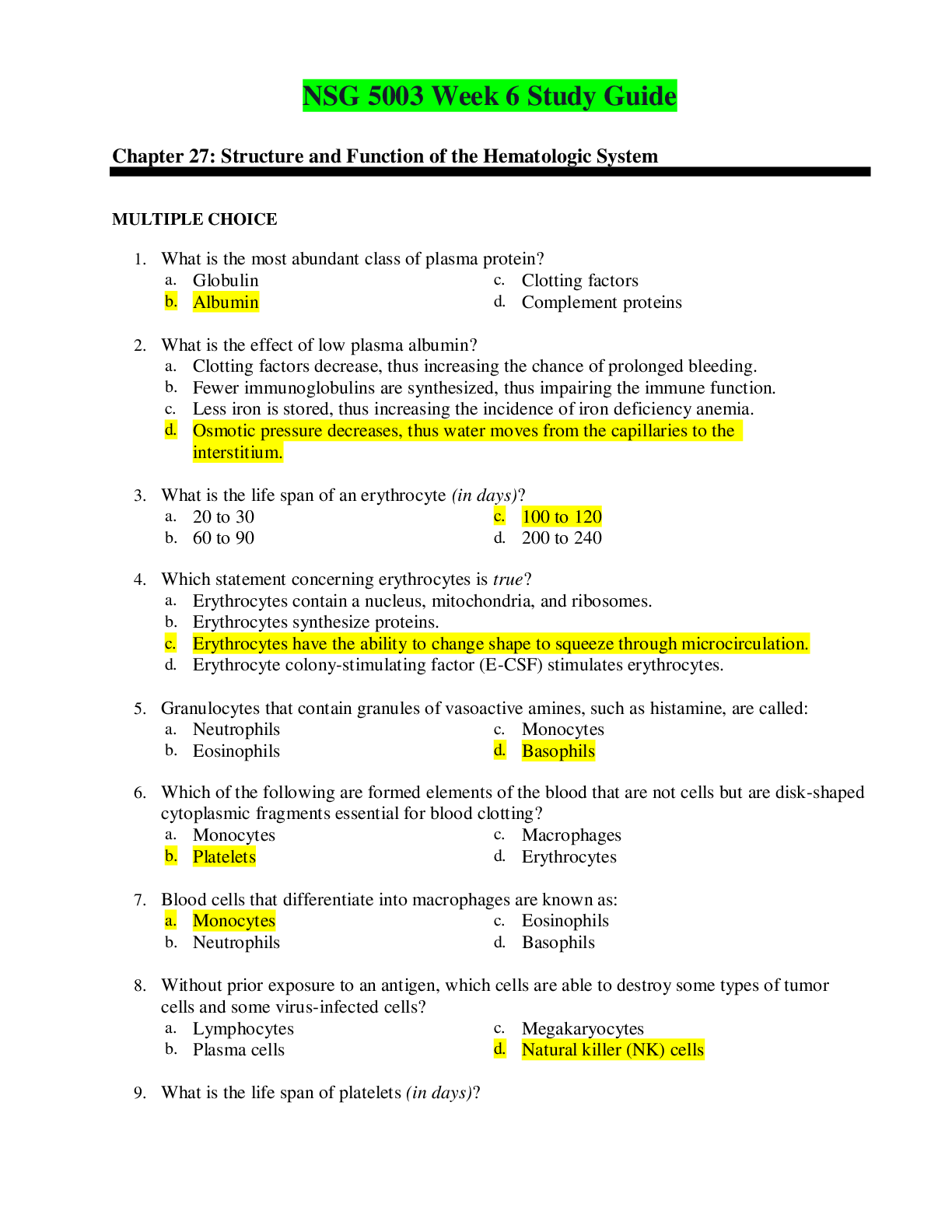 NSG 5003 Week 6 Study Guide Chapter 27: Structure and Function of the Hematologic System MULTIPLE CHOICE 1. What is the most abundant class of plasma protein? 2. What is the effect of...