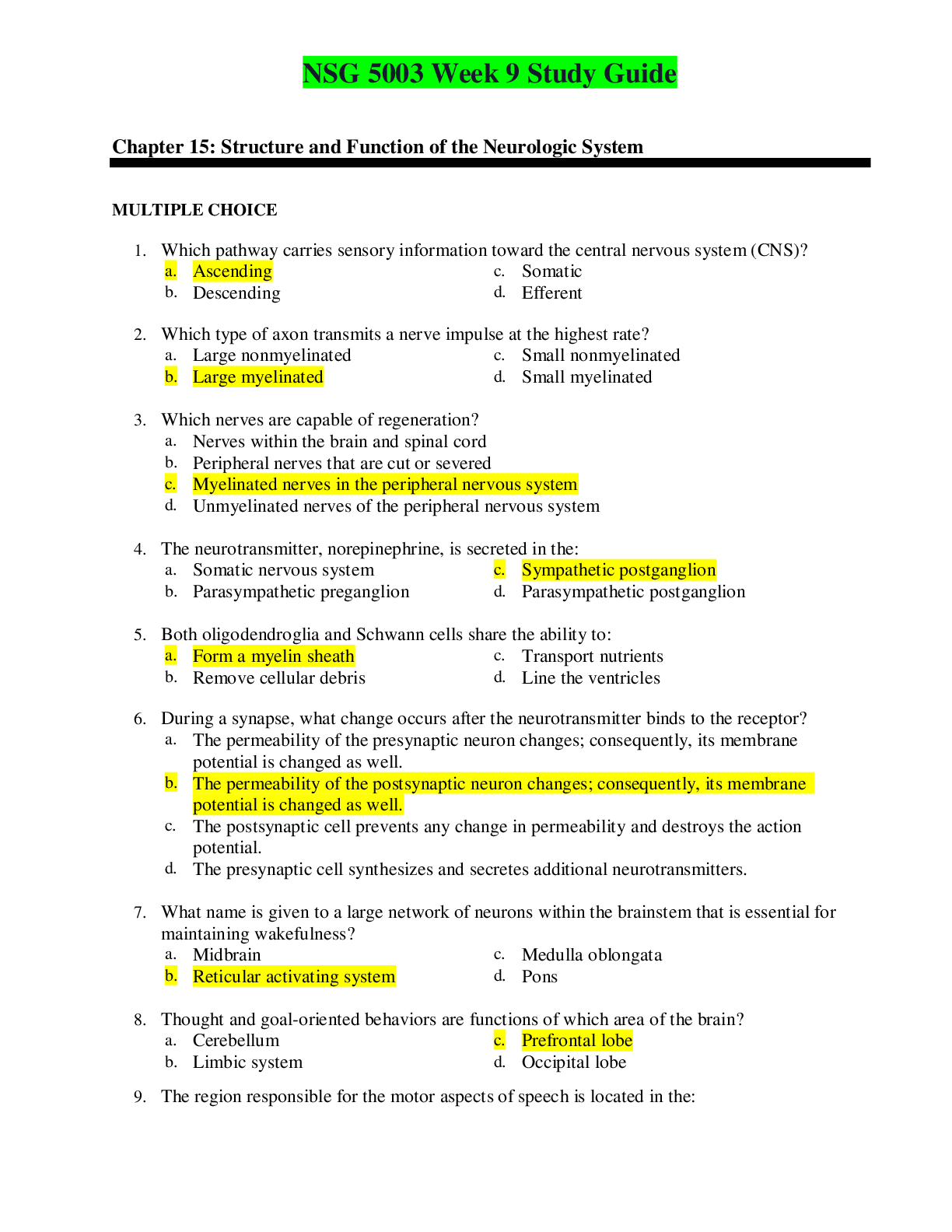 NSG 5003 Week 9 Study Guide Chapter 15: Structure and Function of the Neurologic System MULTIPLE CHOICE 1. Which pathway carries sensory information toward the central nervous system (CNS)...