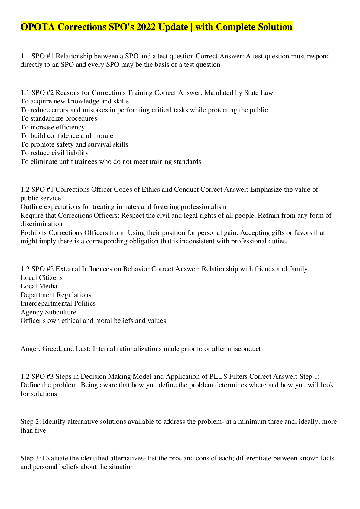 1.1 SPO #1 Relationship between a SPO and a test question - ✔✔A test question must respond directly to an SPO and every SPO may be the basis of a test question 1.1 SPO #2 Reasons for Corrections Tra...