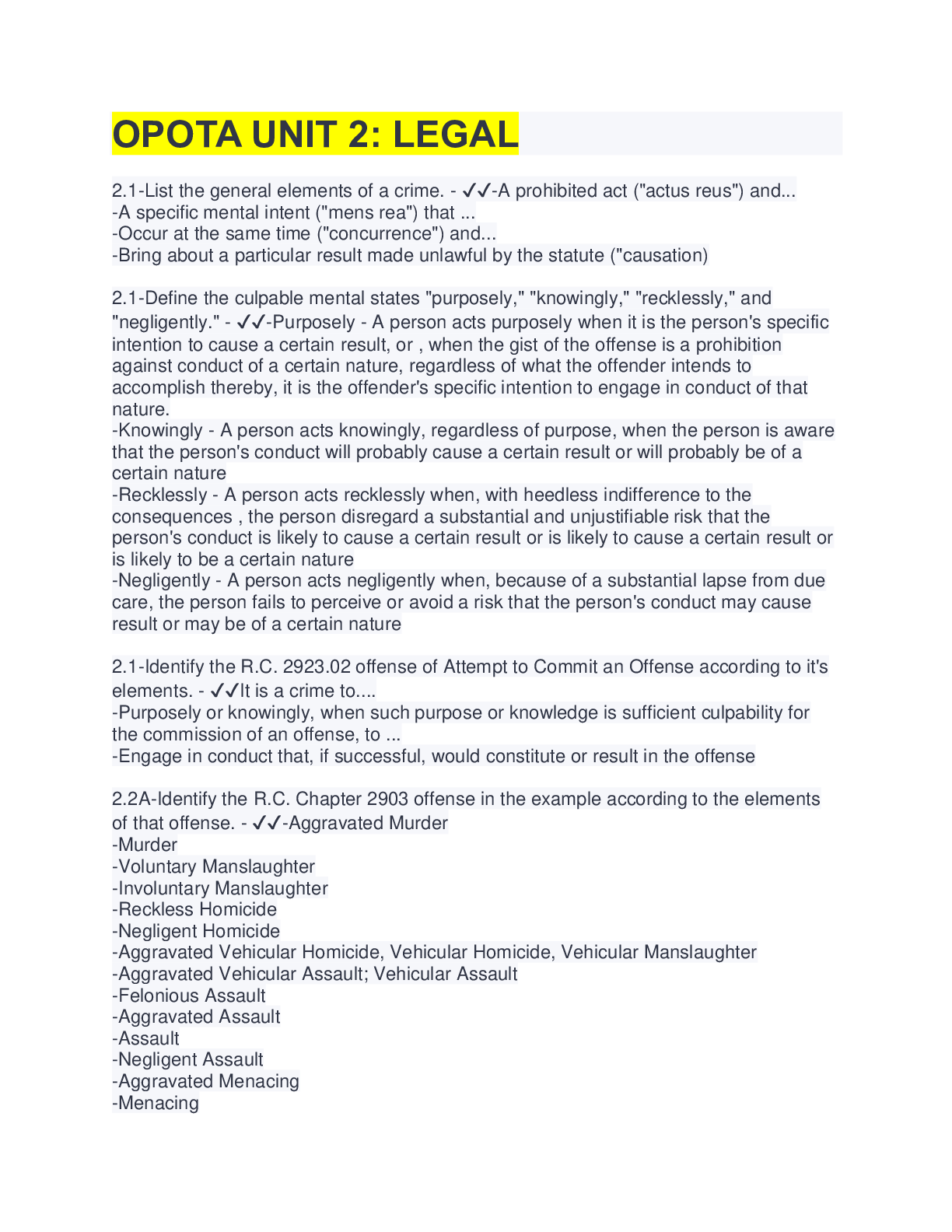Law> STUDY GUIDE > OPOTA UNIT 2: LEGAL | 157 Questions with 100% Correct Answers (All)