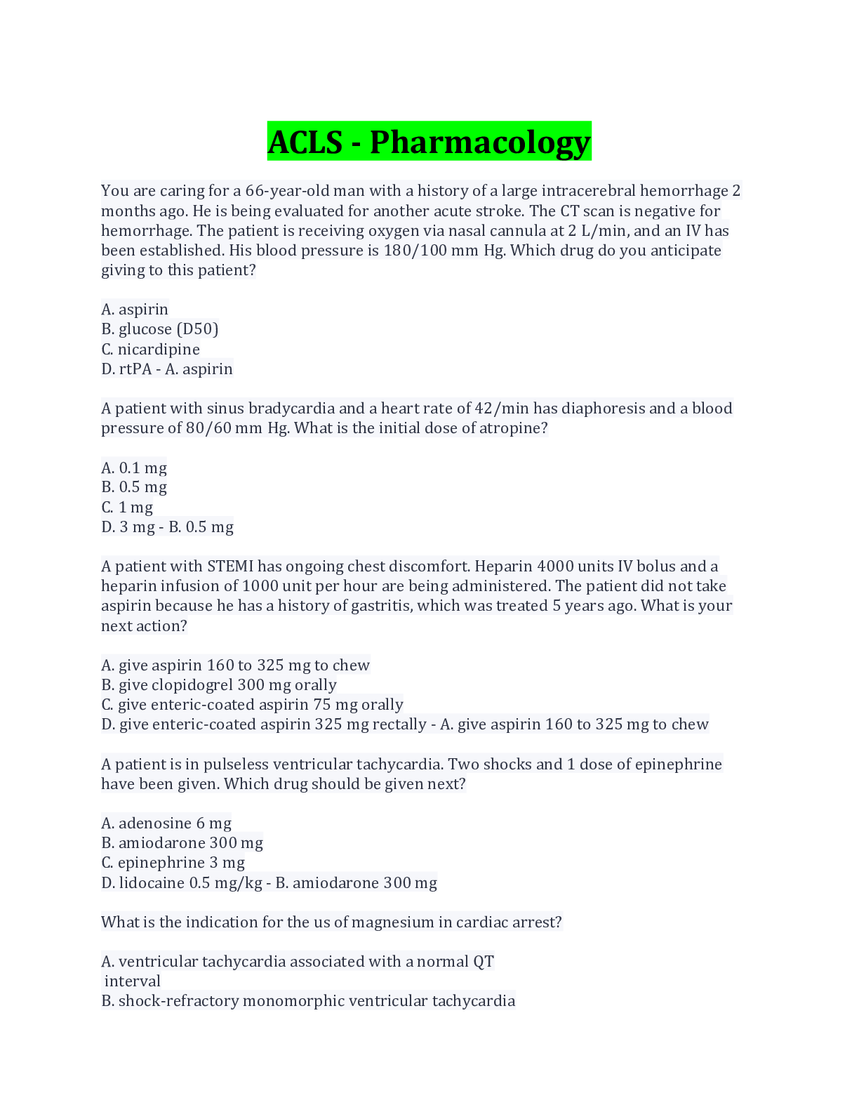 ACLS - Pharmacology Multiple Questions And Answers Latest Update With Complete Solution Rated A.
