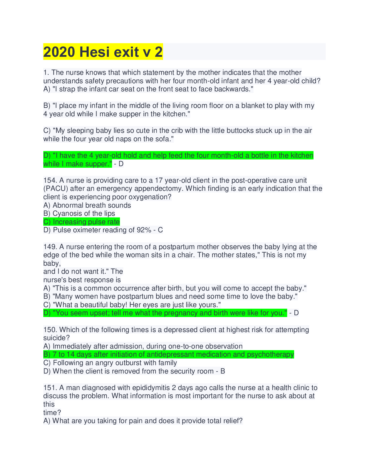 *NURSING> QUESTIONS & ANSWERS > Hesi 2020 exit V2 answered; attempt score 100% distinction level verified. (All)