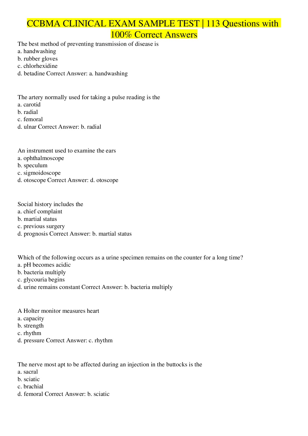 Health Care> EXAM > CCBMA CLINICAL EXAM SAMPLE TEST | 113 Questions with 100% Correct Answers (All)