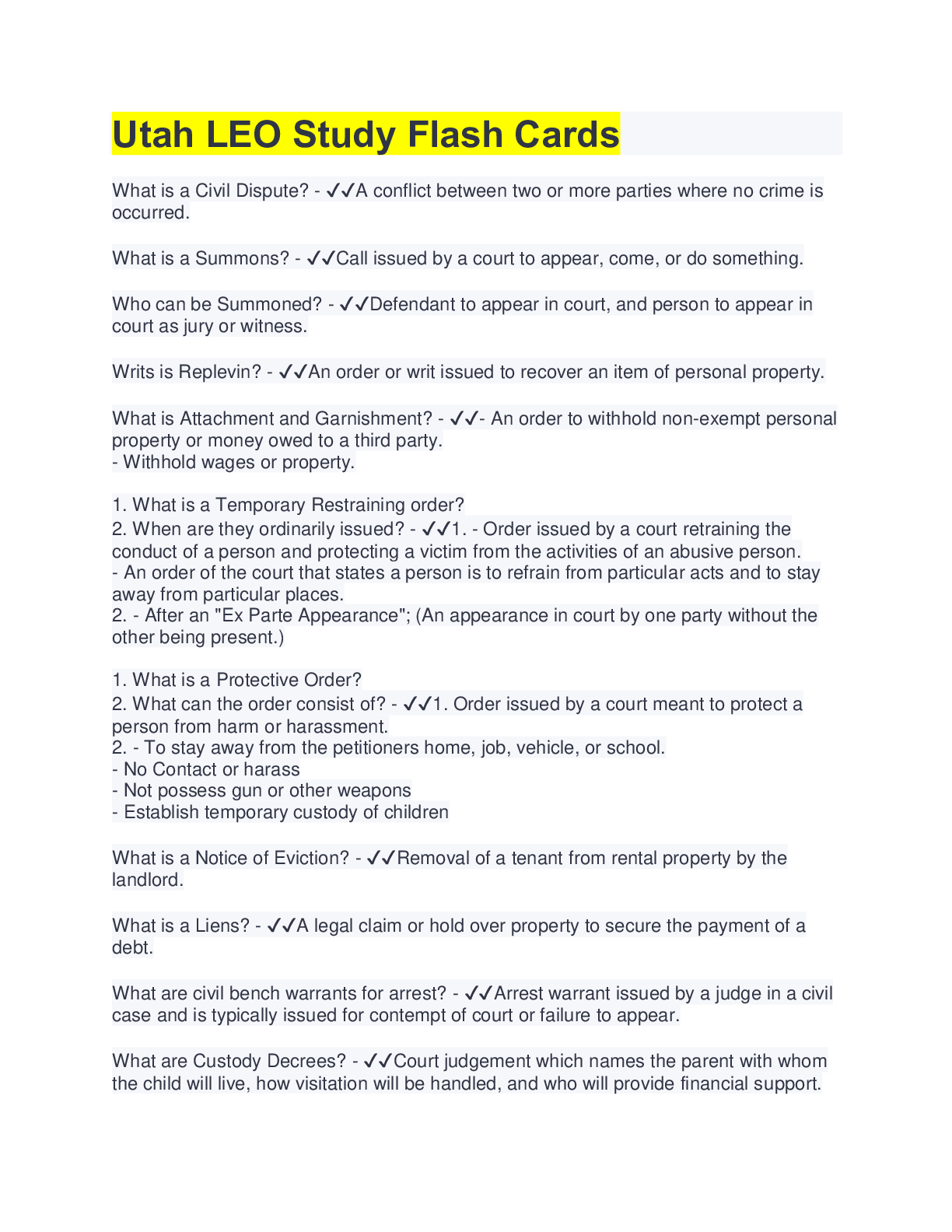 Government> EXAM > Utah LEO Study Flash Cards | 283 Questions | 100% Correct Answers (All)