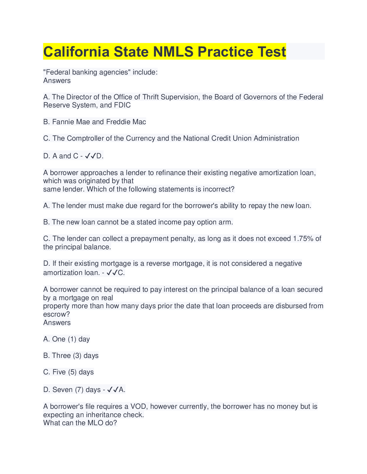 Business> EXAM > California State NMLS Practice Test | 100 Questions | 100% Correct Answers (All)