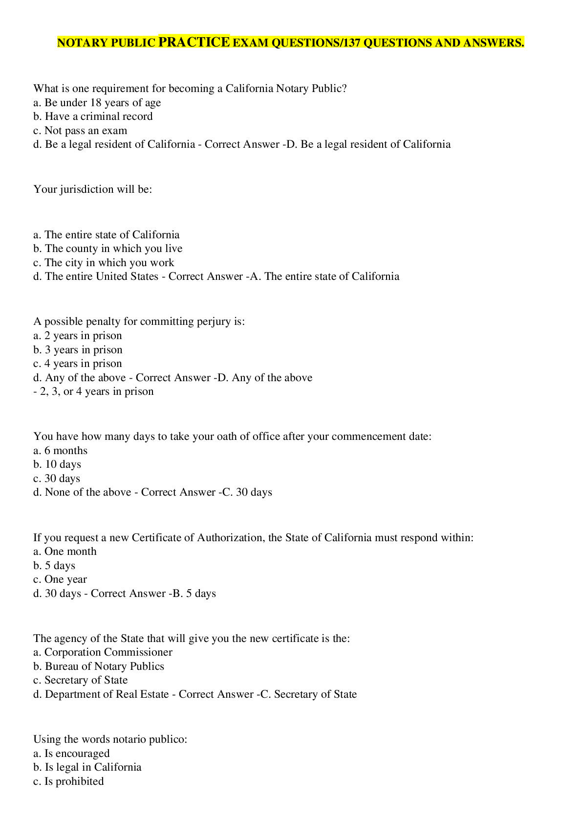 Law> EXAM > CALIFORNIA NOTARY PUBLIC PRACTICE EXAM QUESTIONS | 137 Questions with 100% Correct Answers (All)