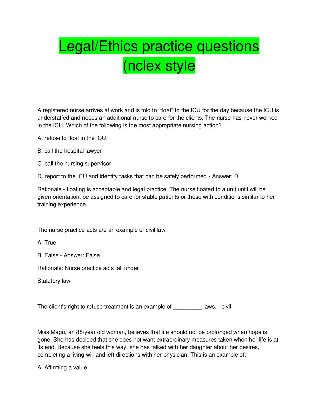 *NURSING> EXAM > Legal/Ethics practice questions (nclex style) 2022/23 with COMPLETE SOLUTION (All)