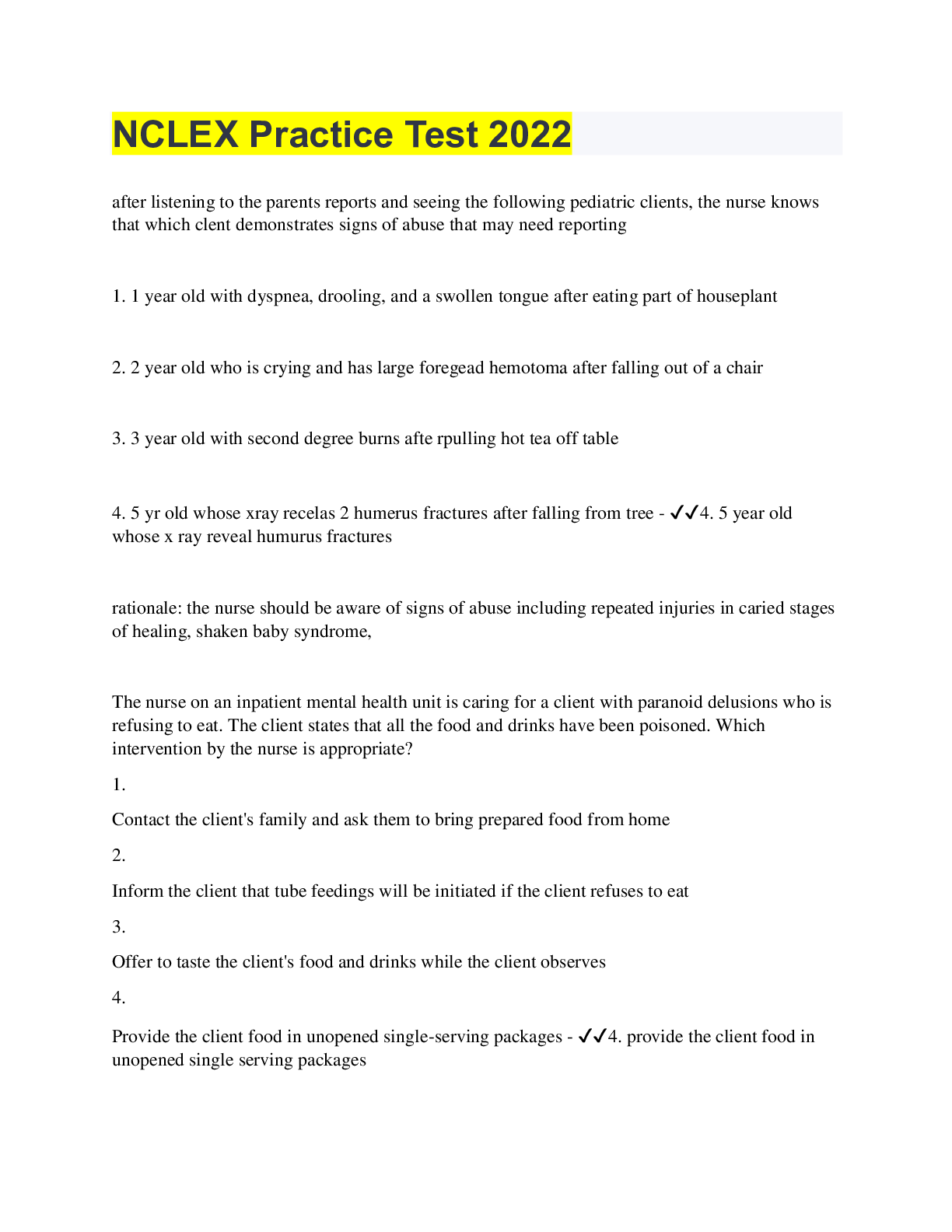 *NURSING> EXAM > NCLEX Practice Test 2022 with COMPLETE SOLUTION (All)