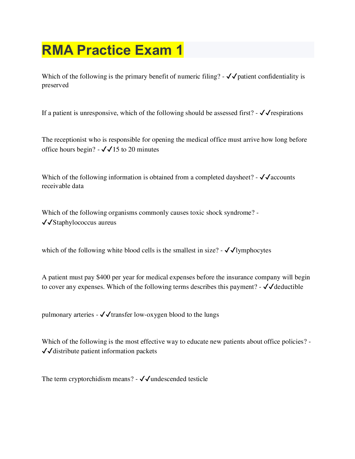 Health Care> EXAM > RMA Practice Exam with COMPLETE SOLUTION | 158 Questions with 100% Correct Answers (All)